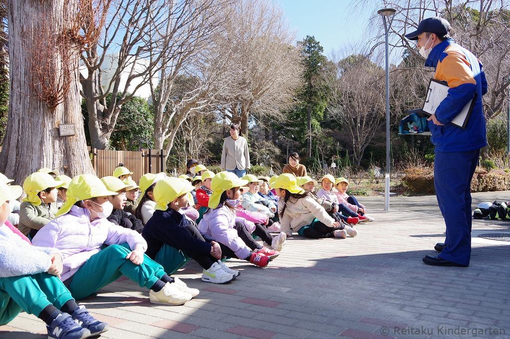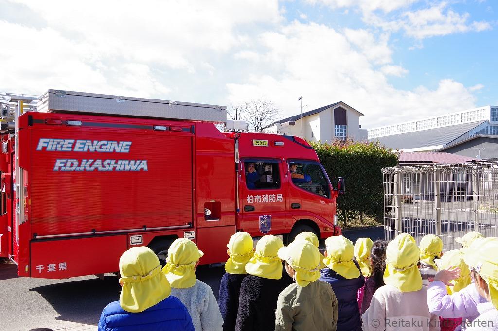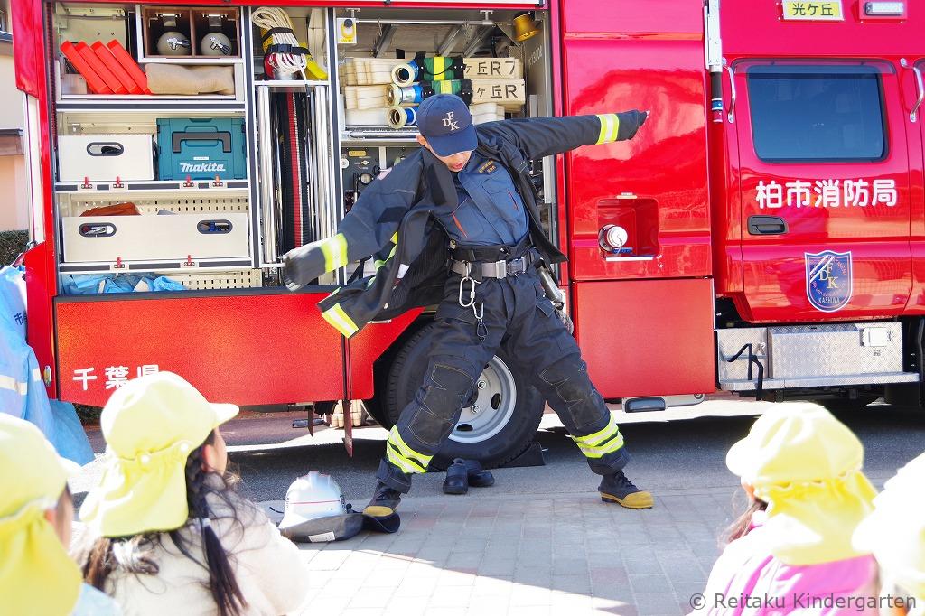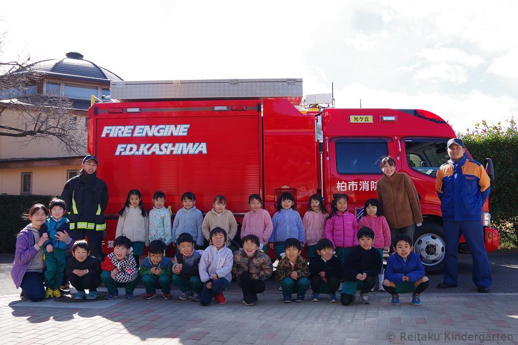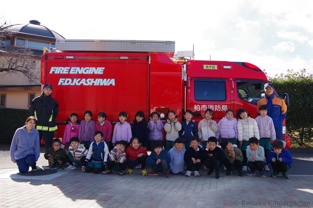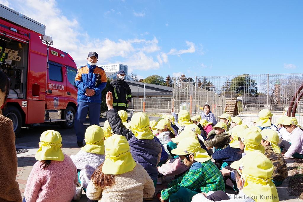 2月18日(火)、柏市東部消防署光ヶ丘分署の隊員の方々が幼稚園に消火訓練のために来てくれました。例年この時期に消防署に見学に伺っていましたが、今回は特別に消防隊員の方が消防車で幼稚園まで来てくれるということで子どもたちも大喜びです。急病人が出たり、交通事故が発生したり、また火災が発生したりすると出動し活躍をされる消防署員の皆さんの仕事の内容を知り、あわせて地震や火事など身近な危険を知って防災意識を持ってもらうことをねらいとして実施しました。