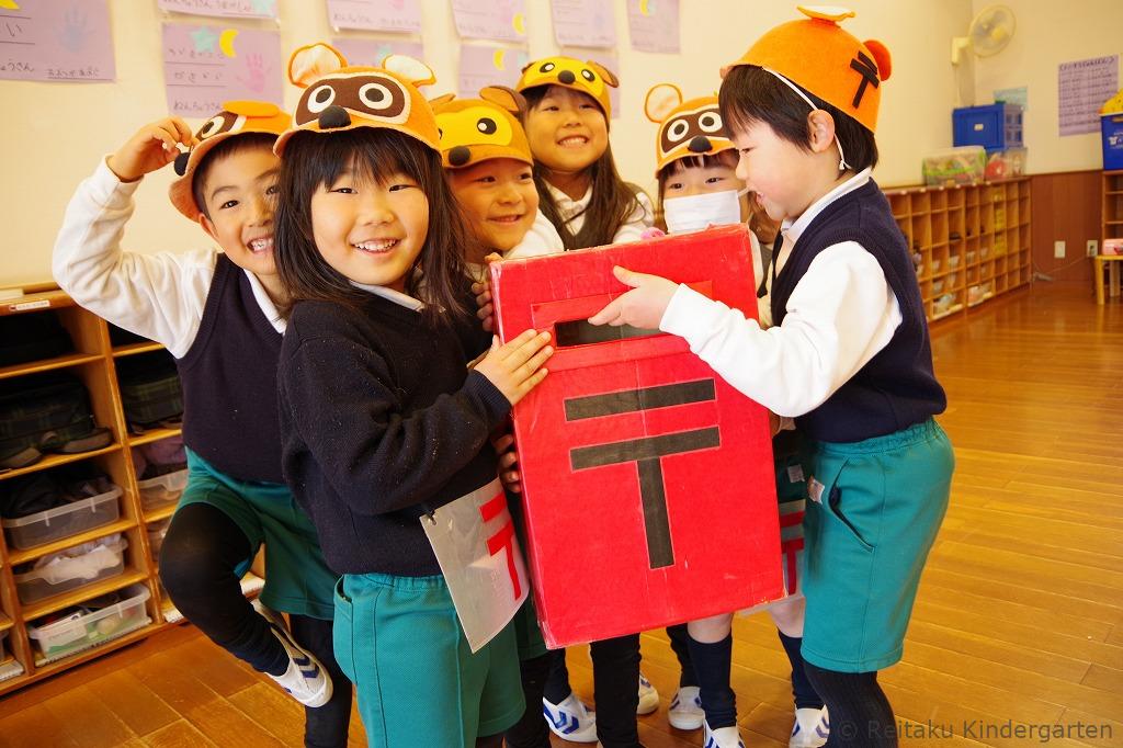 郵便ポストは、廊下や事務室前に備え付けてあります。お昼後にお当番さんがカッパ・ポンポコゆうびんやさんになってポストの中からハガキを回収し、あて先のクラスや先生に届けています。お便りをもらったお友だちは、とてもうれしそうです。親しいお友だち、異年齢のペアになったお友だち、他のクラスの先生や事務室の先生に、たくさんの葉書きが毎日寄せられました。大忙しのカッパ・ポンポコゆうびんやさん沢山配達してくれてありがとう!