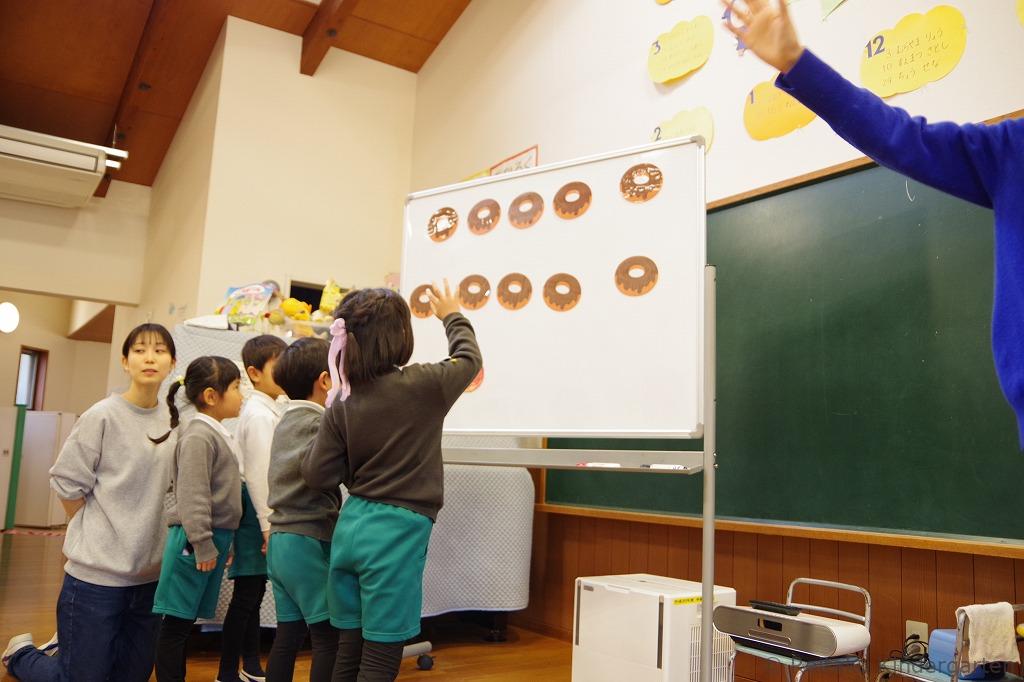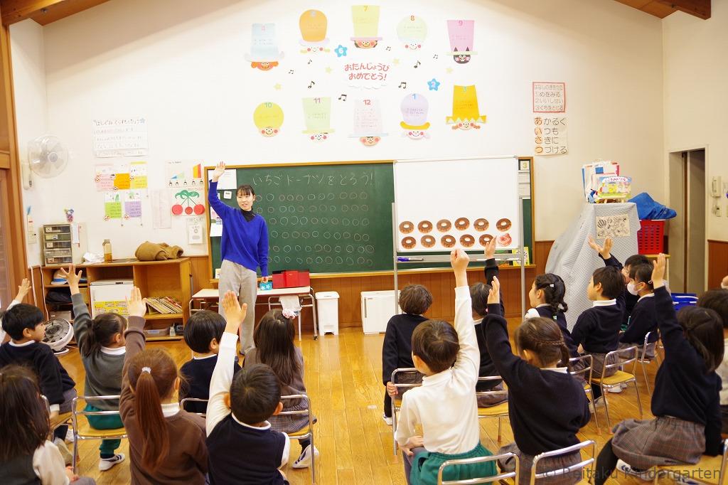 3月6日(木)、麗澤幼稚園を卒園した卒園生のお姉さんが、4月から小学校に就学する年長組の子どもたちに向けて、算数に触れて算数の楽しさを感じるための取り組みを行ってくれました。