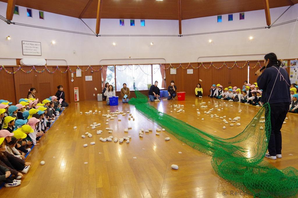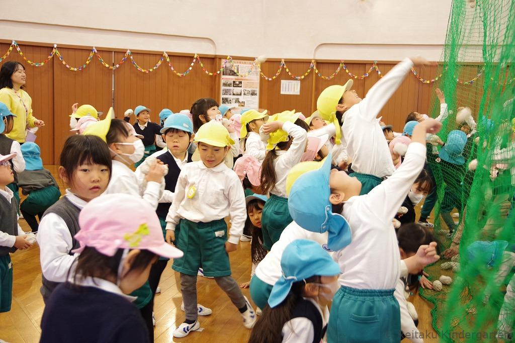 最初は、年少、年中、年長さんのグループでふれあいゲームをし、次に「仲良ししんぶん島」のゲームを行いました。そして2チームに分かれて「玉入れ雪合戦」を楽しみました。
