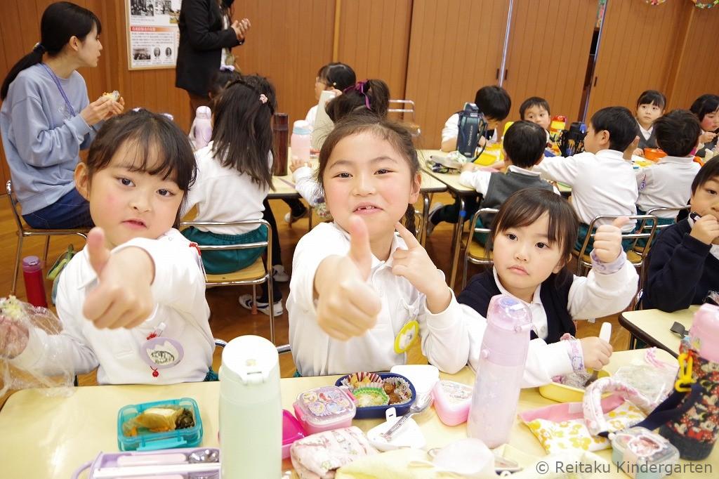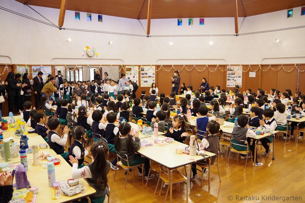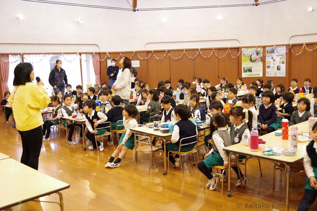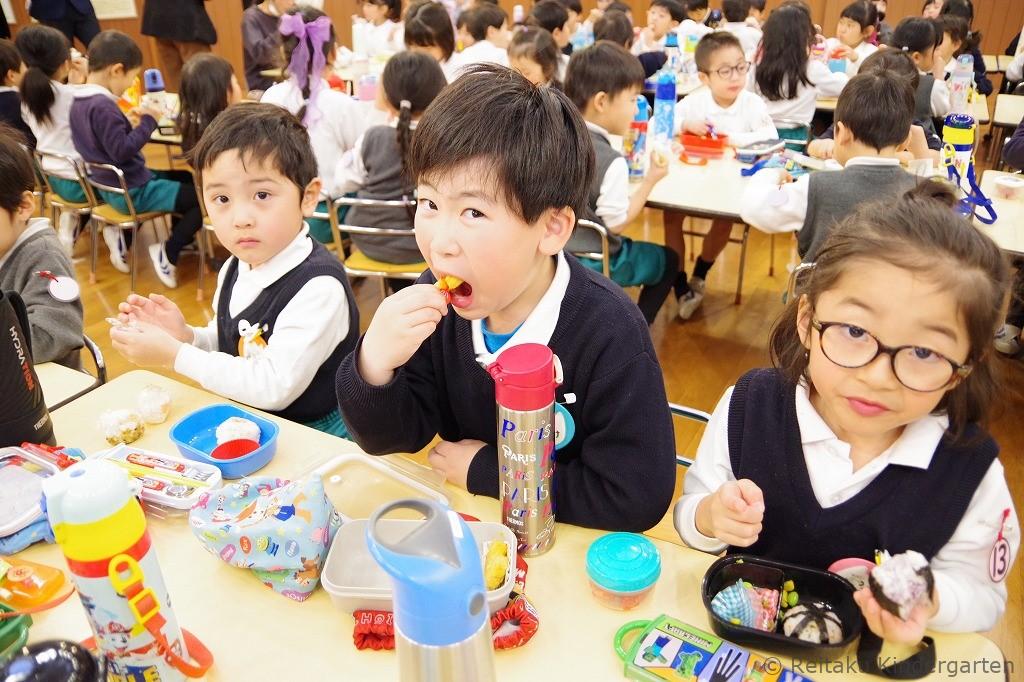 ゲームで楽しく過ごした後、年長さんと一緒にお弁当パーティーを行いました。ペアごとに一緒の机で仲良くお弁当を食べる子ども達。話も弾んだようで皆ニコニコしながら食べていました。