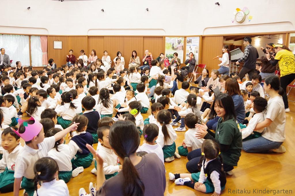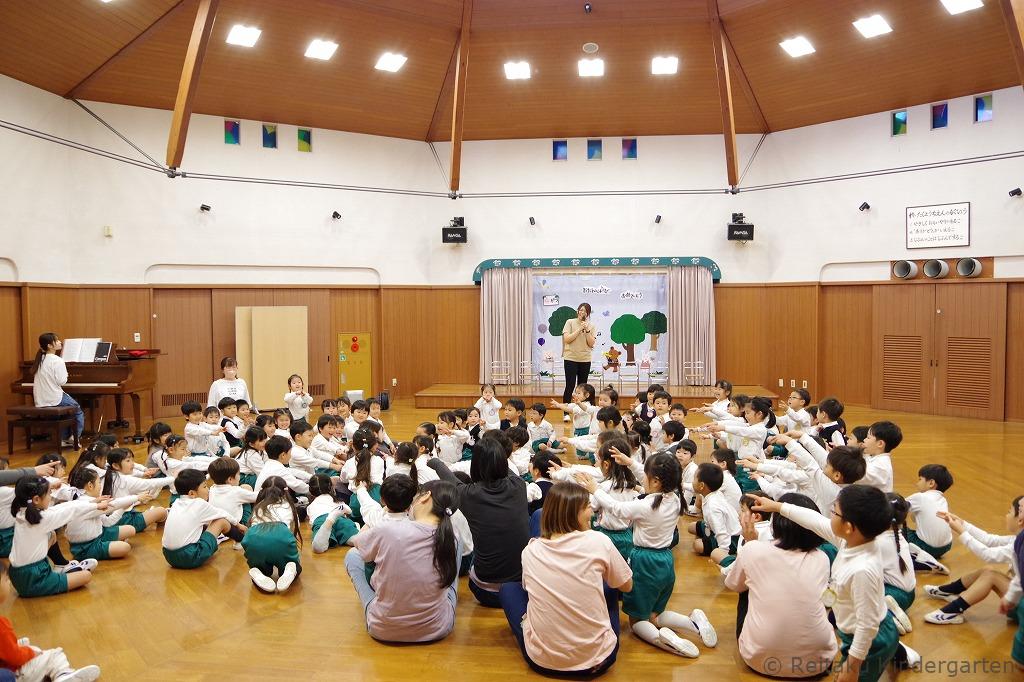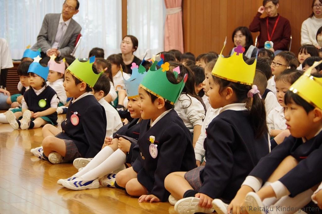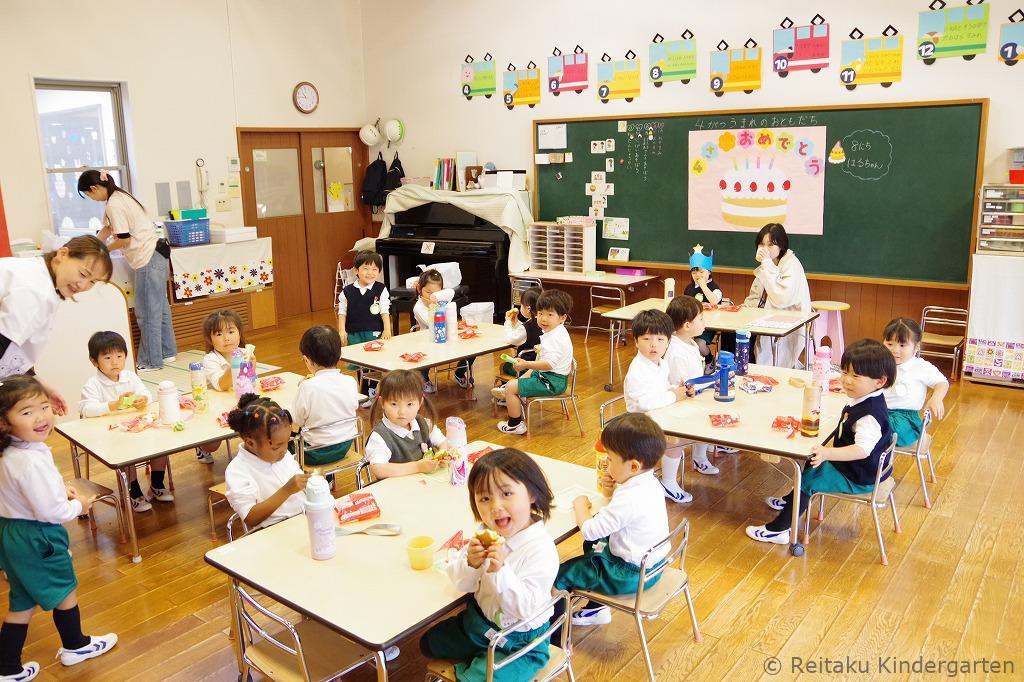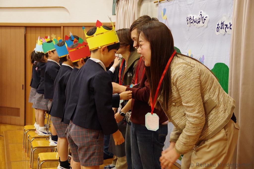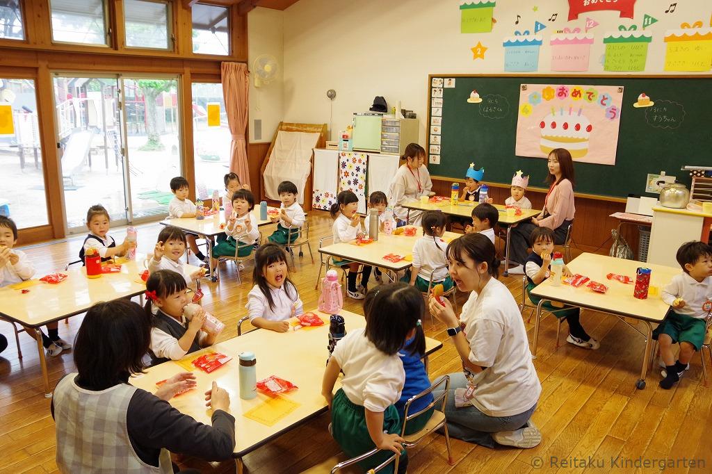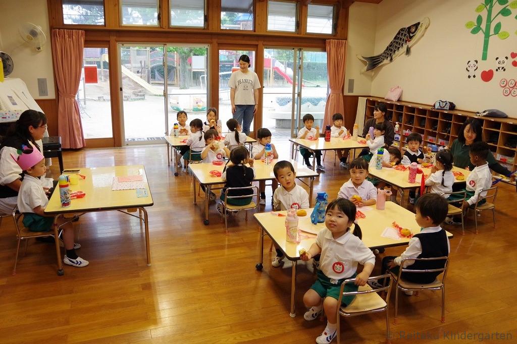 新入園児にとっては、初めての誕生会です。「誕生会って、どんなことをするのかな?」とみんなこの日を楽しみにしていました。遊戯室で先生方による出し物を見た後、各教室でも誕生児のお祝いをしました。誕生児の保護者の方も一緒に参加していただきました。