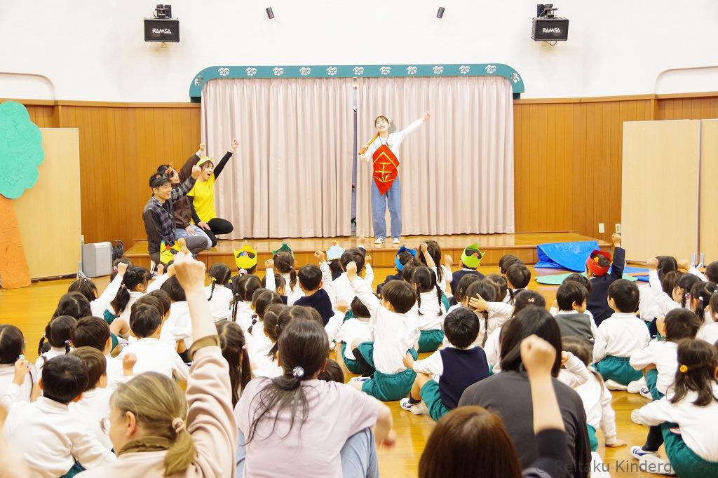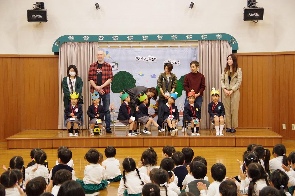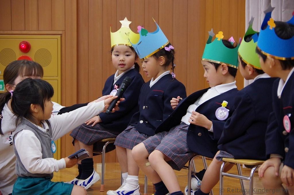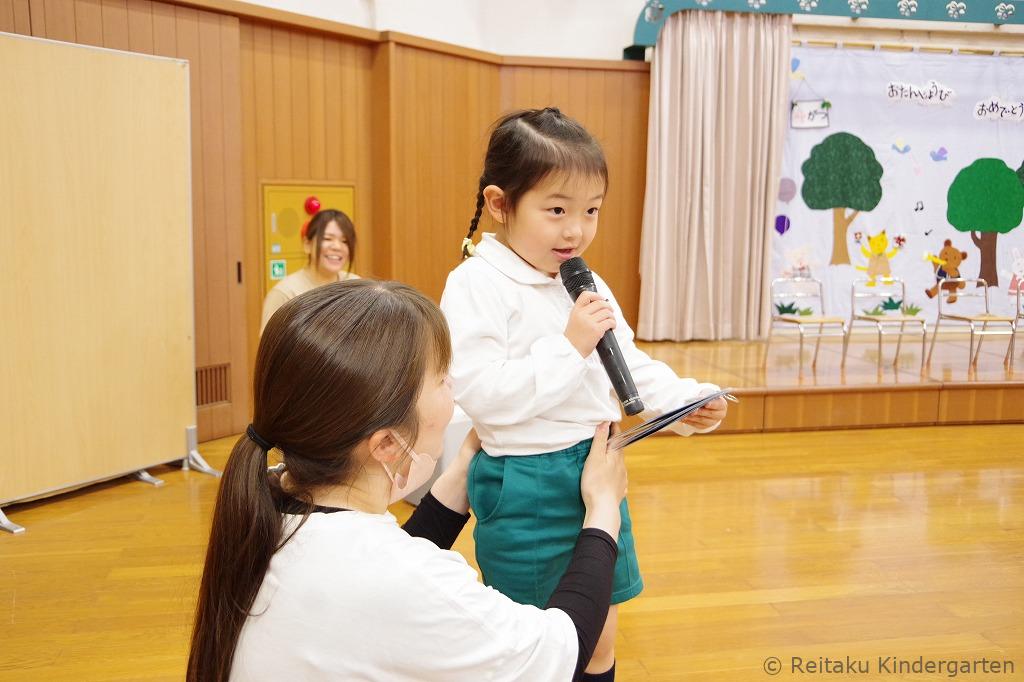 遊戯室では、最初に保護者の方と一緒に誕生児が入場してきました。前に勢ぞろいした誕生児のお友だちは、緊張しながらもみんなニコニコ顔です。誕生会の司会は、年長組が担当し、誕生日を迎えたお友だちへのインタビューもありました。みんな質問にとてもハキハキと答えていました。