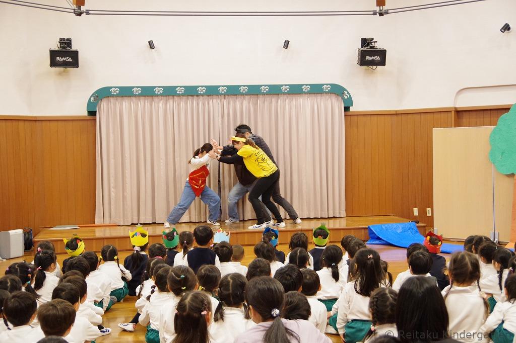 最後に先生の出し物、金太郎の劇がありました。記念撮影後、教室に戻って、ケーキを食べながらみんなでお友だちの誕生をお祝いします。年少組の新入園児は、初めての誕生会とても楽しかったようです。ケーキもニコニコしながらおいしそうに残さず食べていました。