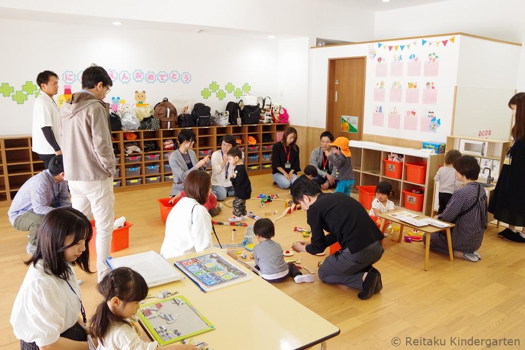 活動の場は、新園舎「子育ての森どんぐり」。ぴかぴかの新しい保育室で、先生と子どもたちが笑顔で過ごしています。登園時には、玄関で先生に「おはようございます」と元気にご挨拶。その後、保護者と一緒に保育室へ向かい、午前中の活動を楽しんでいます。