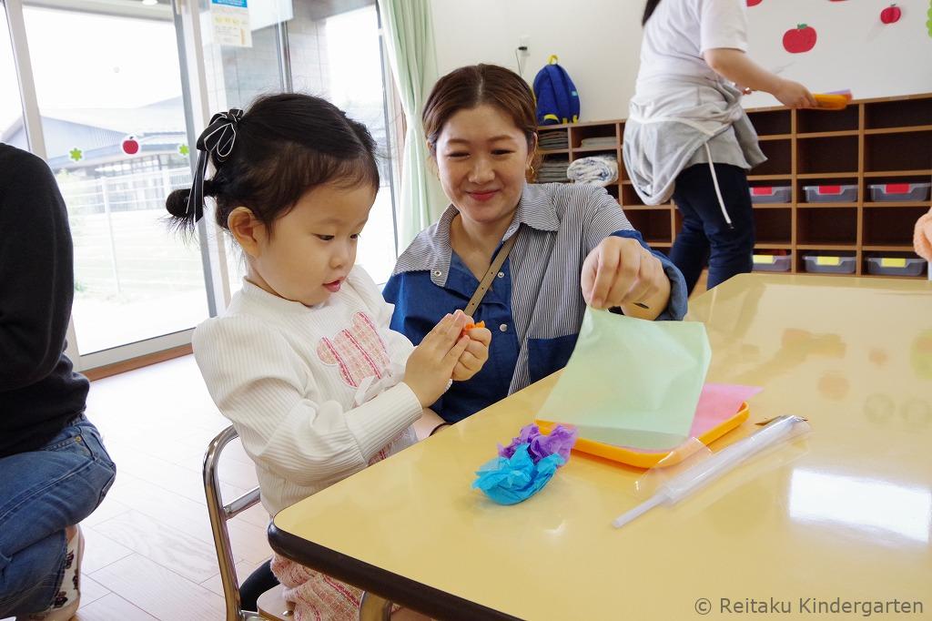 手遊びや簡単な制作あそび、紙芝居の読み聞かせ、園庭あそびなど子どもたちが「幼稚園って楽しいな!」と思える活動を行いながら、身支度など基本的な生活習慣も身に着けていきます。