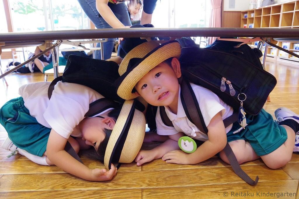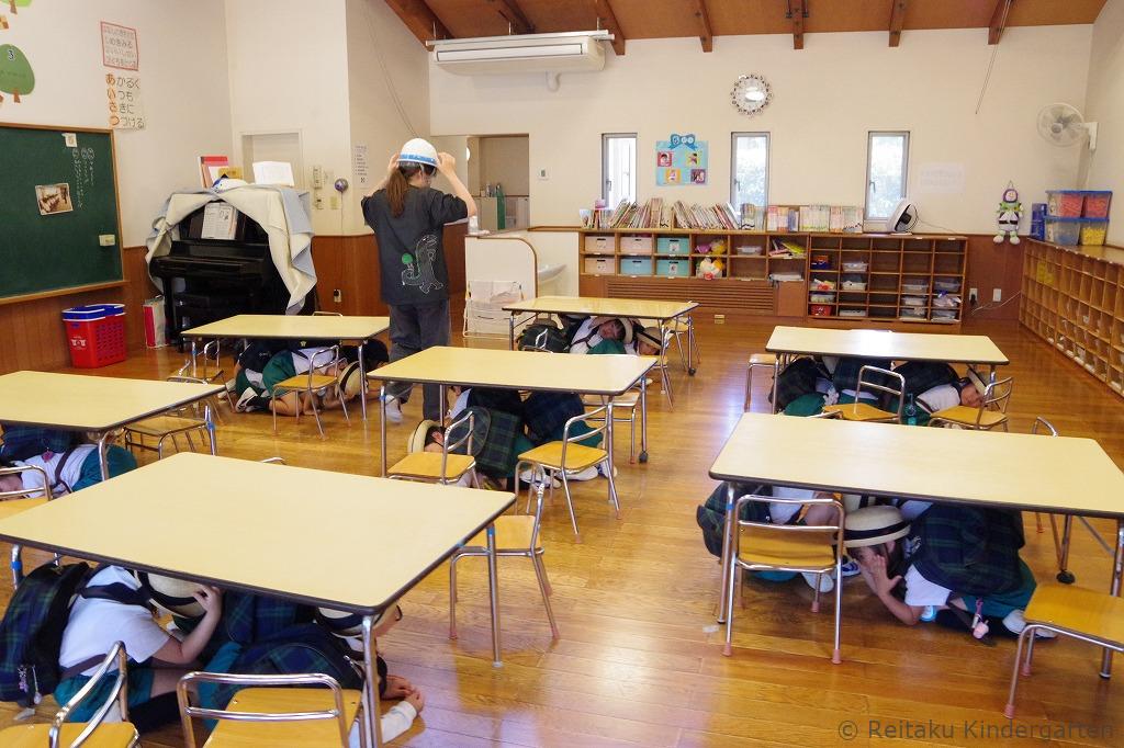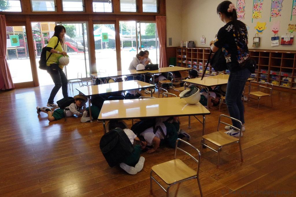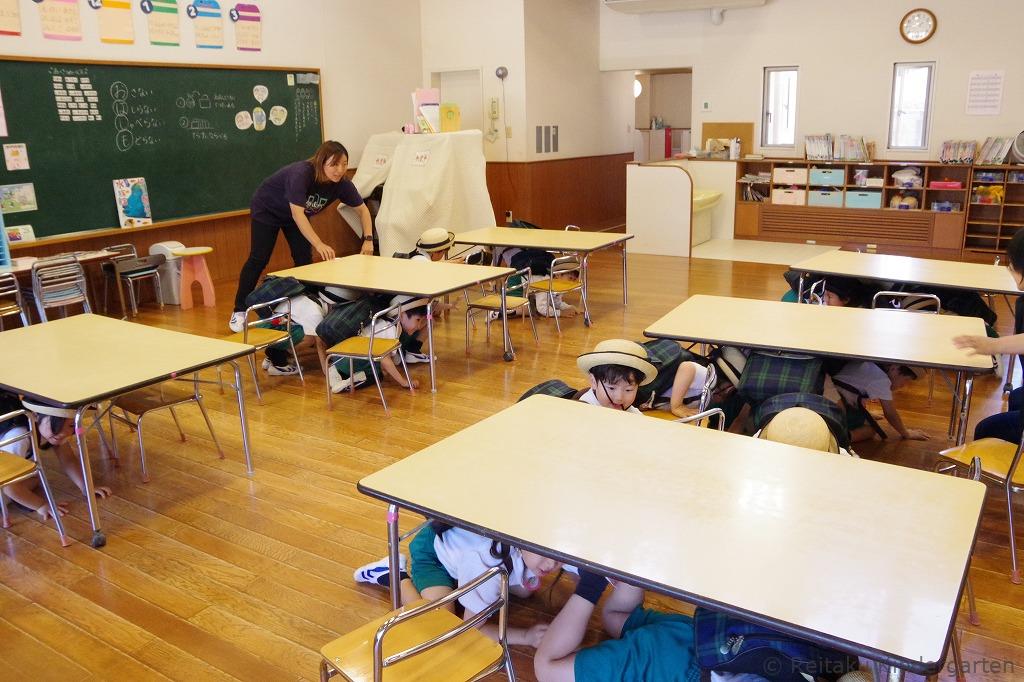 午後1時45分、事務室より訓練用の緊急地震速報が流され、子どもたちは、先生の指示により、机の下に素早く潜り込みました。その後、余震に備えた訓練として園庭への避難を行います。園児たちは、一斉に上履きのまま、園庭に避難しました。