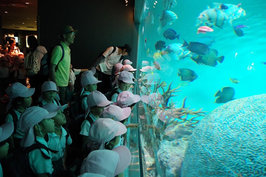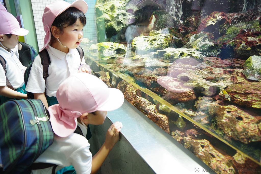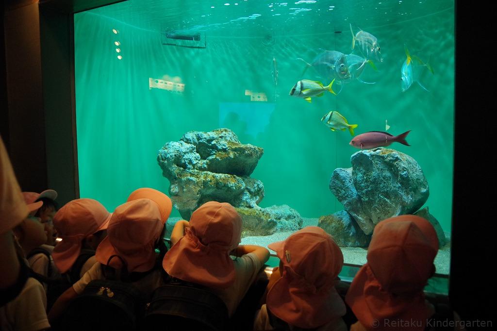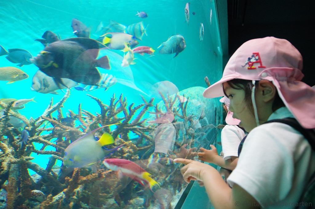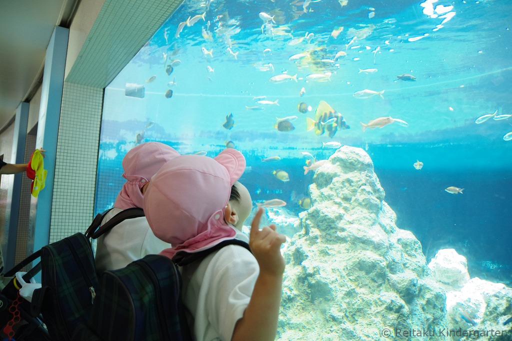 水族園に到着すると、楽しみにしていた子どもたちの目がよりキラキラと輝きます。園内で飼育されているマグロ、エイ、ハゼ、カレイ、ウツボ、ペンギンなど、海の中で生活している生物を子ども達は興味深そうに見学していました。いつも絵本で見ている魚や動物を直接目の前で見ることができてみんな大喜びです。