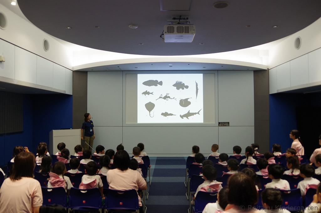 先生と一緒に園内を見て回ったあとは、レクチャールームで葛西臨海水族園の職員の方に「さかなのかたちいろいろ」のテーマで海に生きる生き物について教えてもらいました。