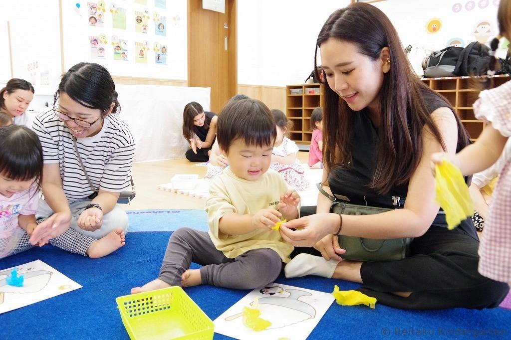 麗澤幼稚園の未就園児クラスでは、親子で季節の制作や運動遊び、ふれあい遊び、園庭での外遊びなどを行い、「幼稚園って楽しい!」という経験を積み重ねてスムーズな入園へとつなげていきます。
