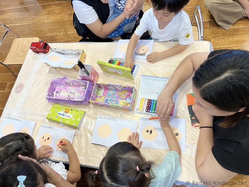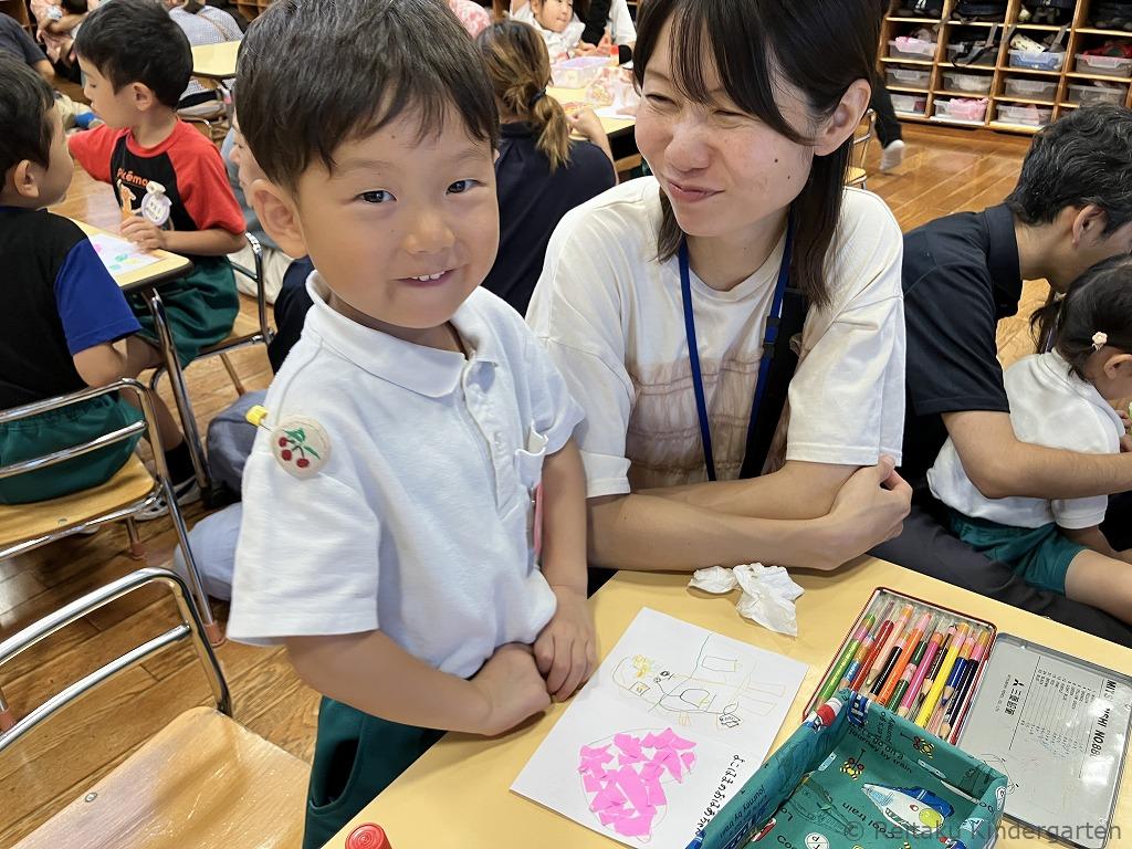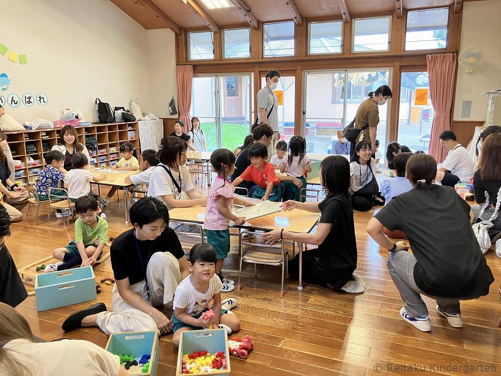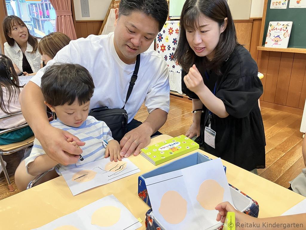 親子一緒に登園し、そのまま教室に入りました。今日は、お母さんと、あるいはお父さんと一緒ですので、いつもと違って子どもたちはとてもうれしそうです。登園後の自由遊びから朝の会、主活動等の半日の保育の流れをゆっくり参観していただきました。