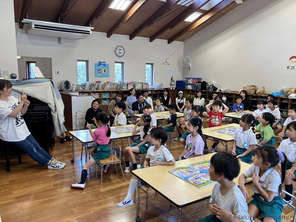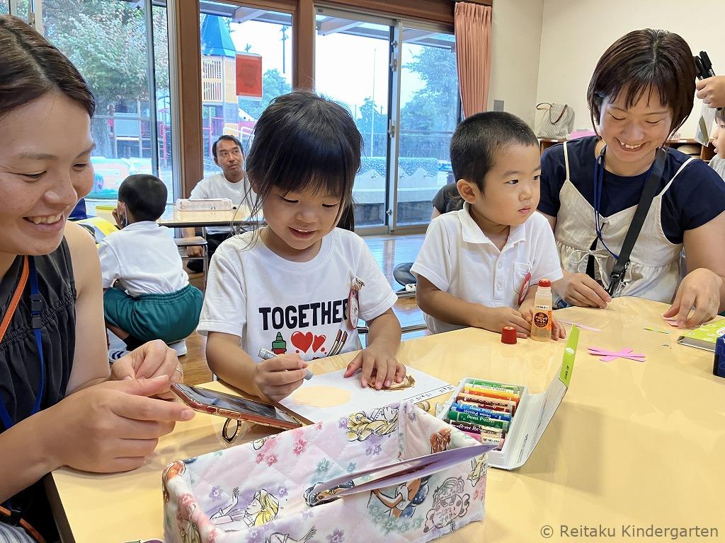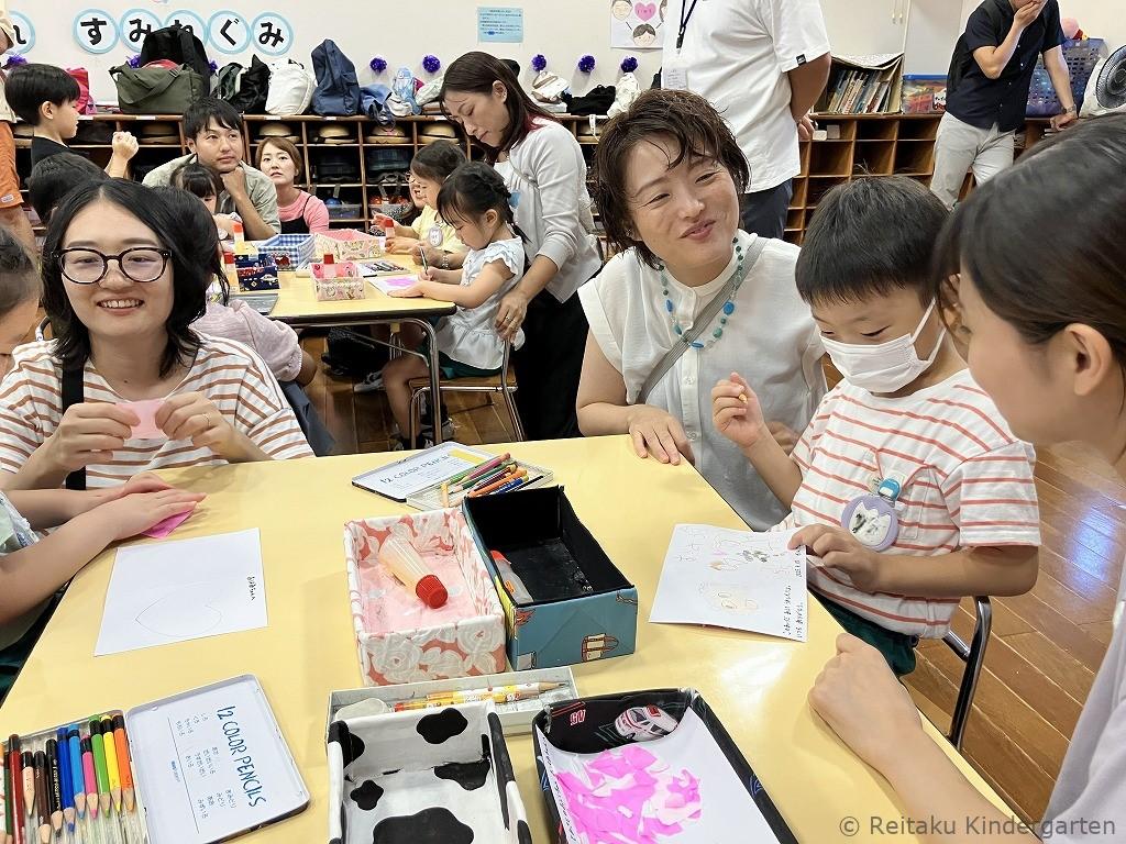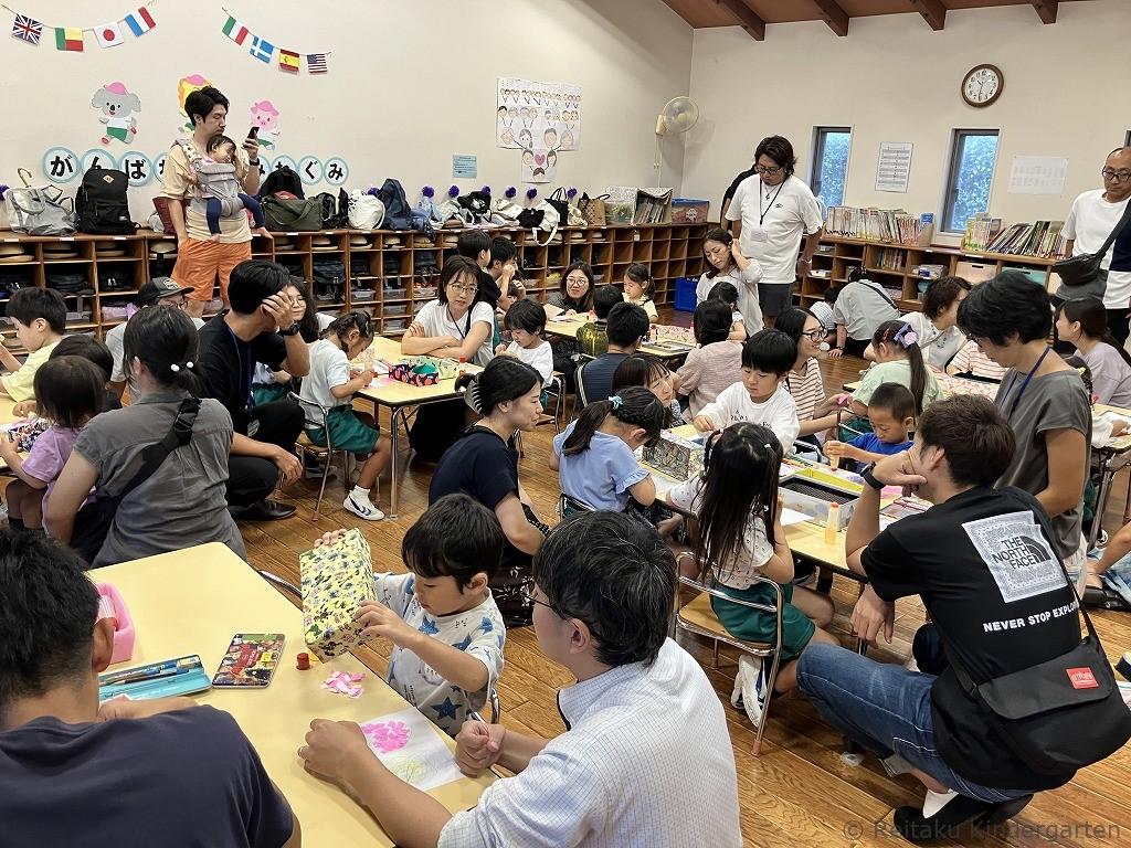 親子一緒に登園し、そのまま教室に入りました。今日は、お母さんと、あるいはお父さんと一緒ですので、いつもと違って子どもたちはとてもうれしそうです。登園後の自由遊びから朝の会、主活動等の半日の保育の流れをゆっくり参観していただきました。