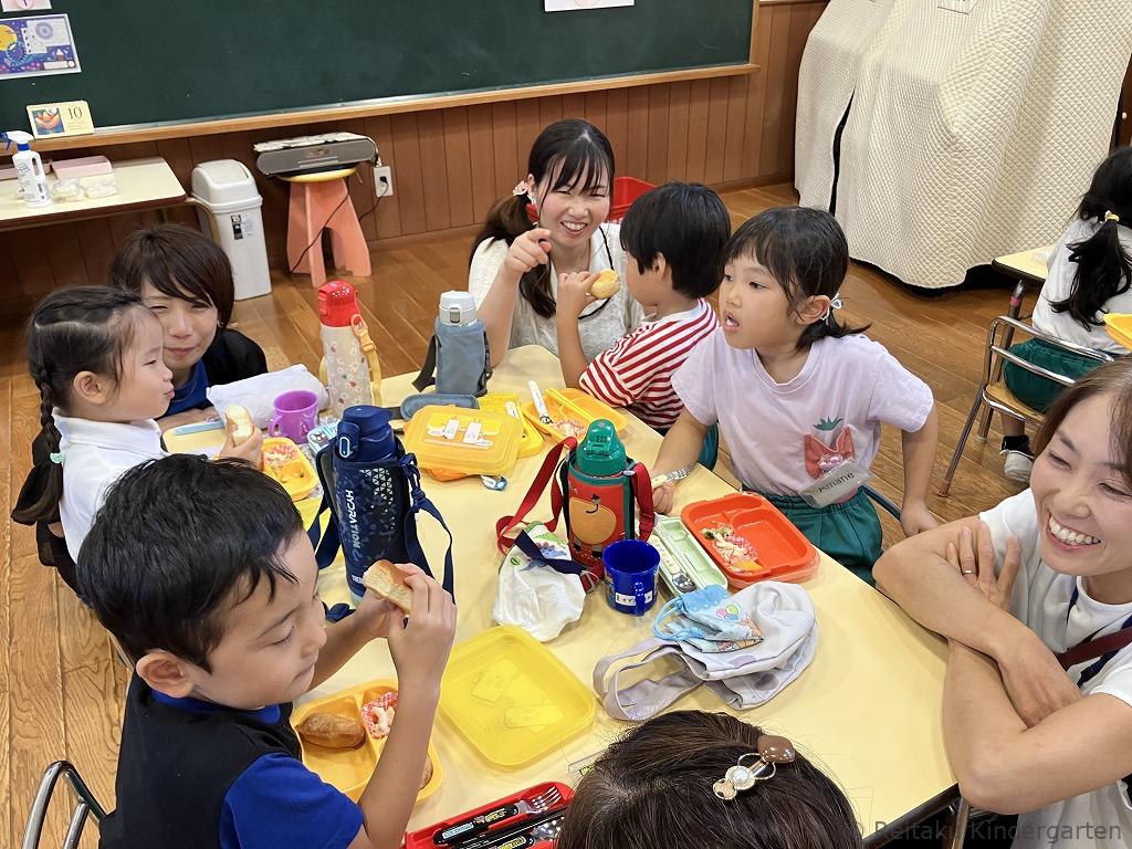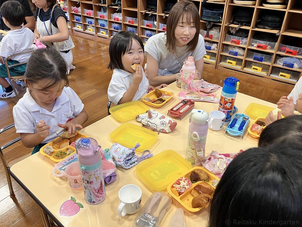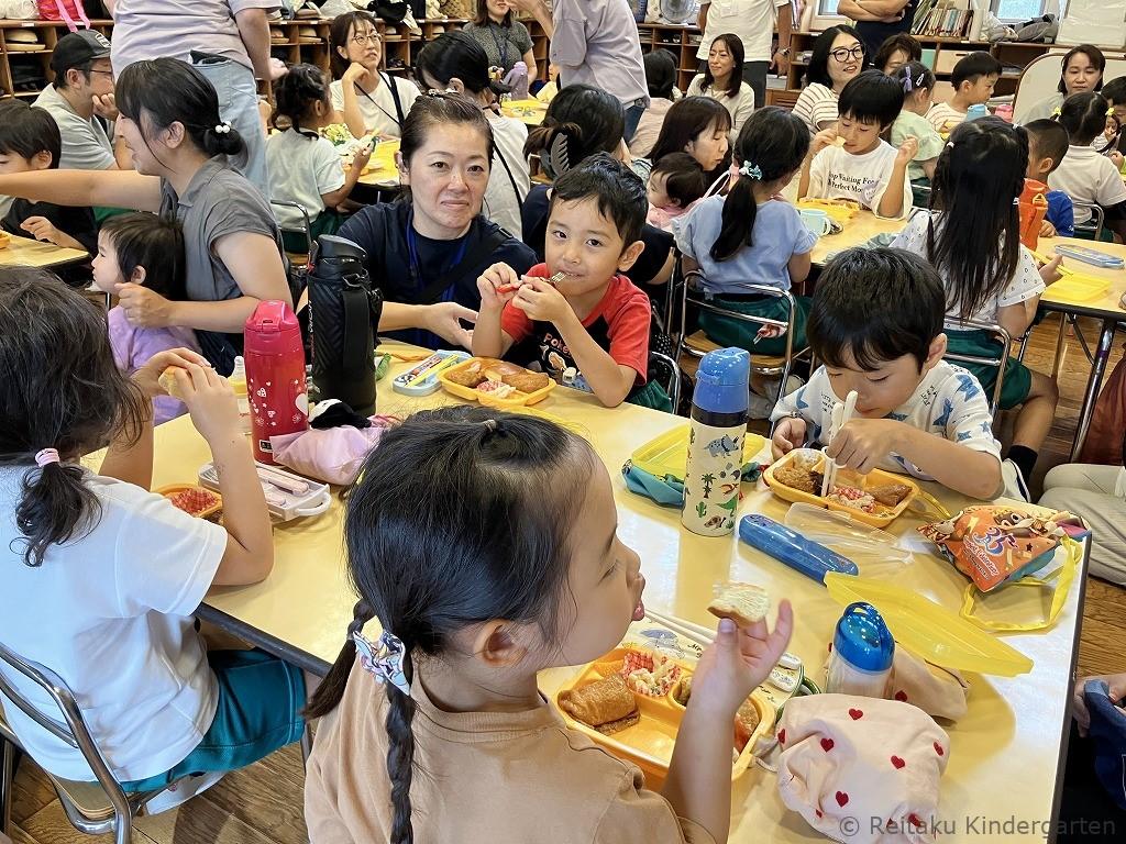 主活動では、各学年で制作や英語の時間や、運動会にかかわる活動をして過ごしました。お昼の時間には保護者の方々に実際に子どもたちが給食やお弁当を食べている様子を見ていただきました。
