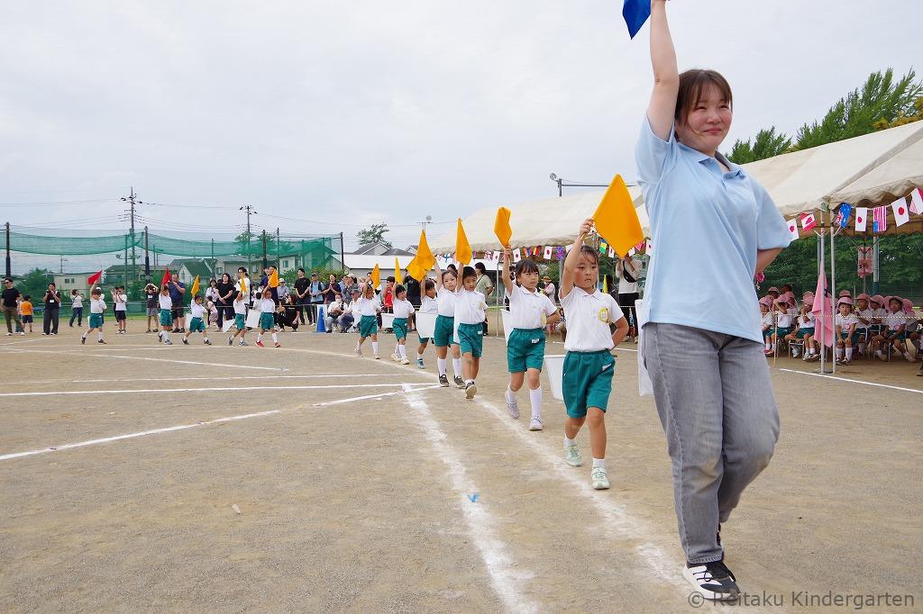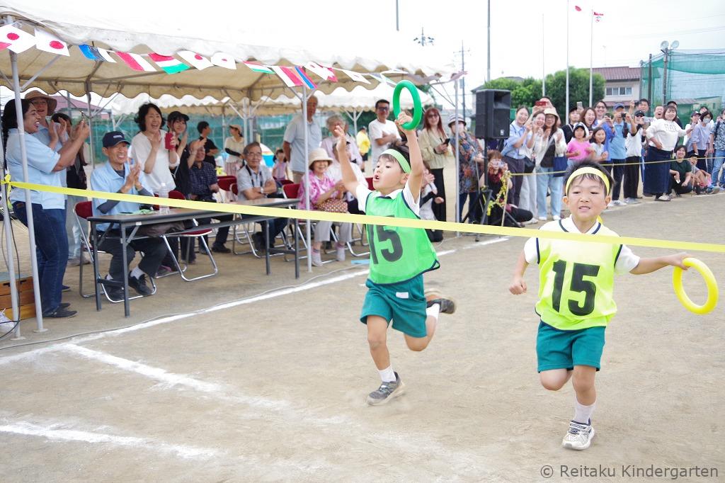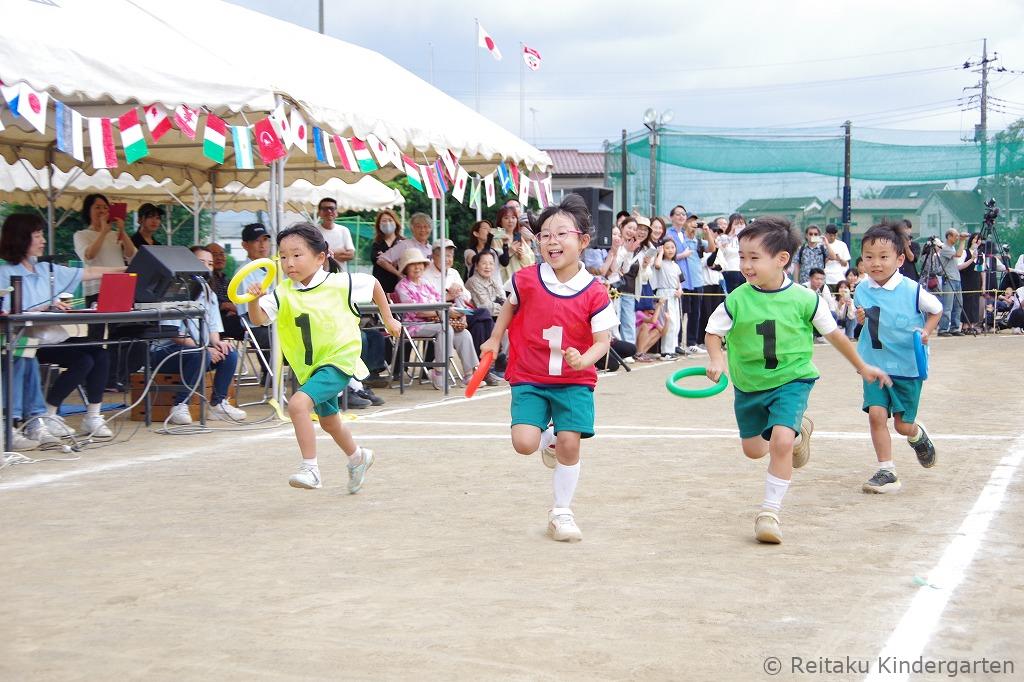 お遊戯では子ども達の入場から、バルーンでは、技が決まるたびに、旗体操では、子どもたちの凛々しい姿に保護者の方々も感動され、沢山の拍手をいただきました。最後に年長さんのクラス対抗リレー競争が行われ、会場全体が追いつ抜かれつの競り合ったレースにより、大きな歓声につつまれました。