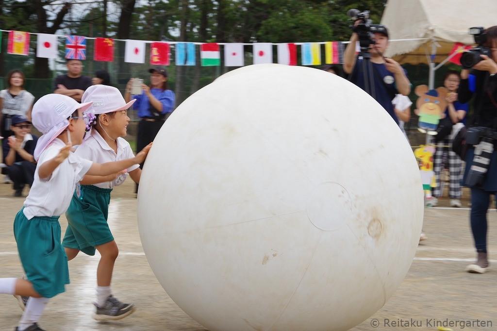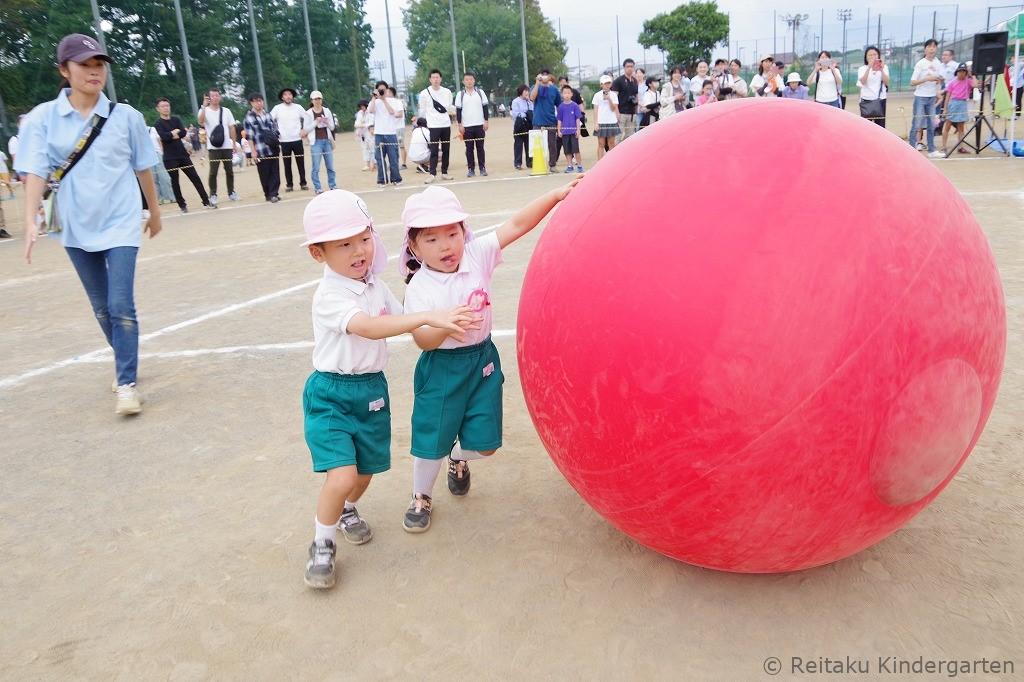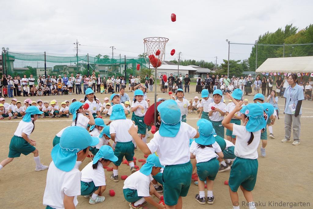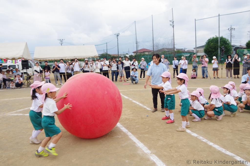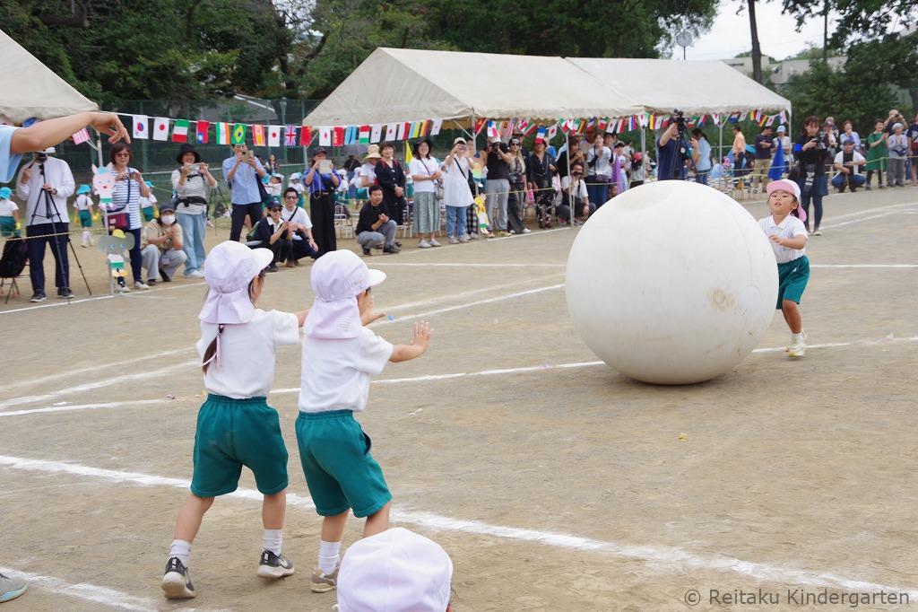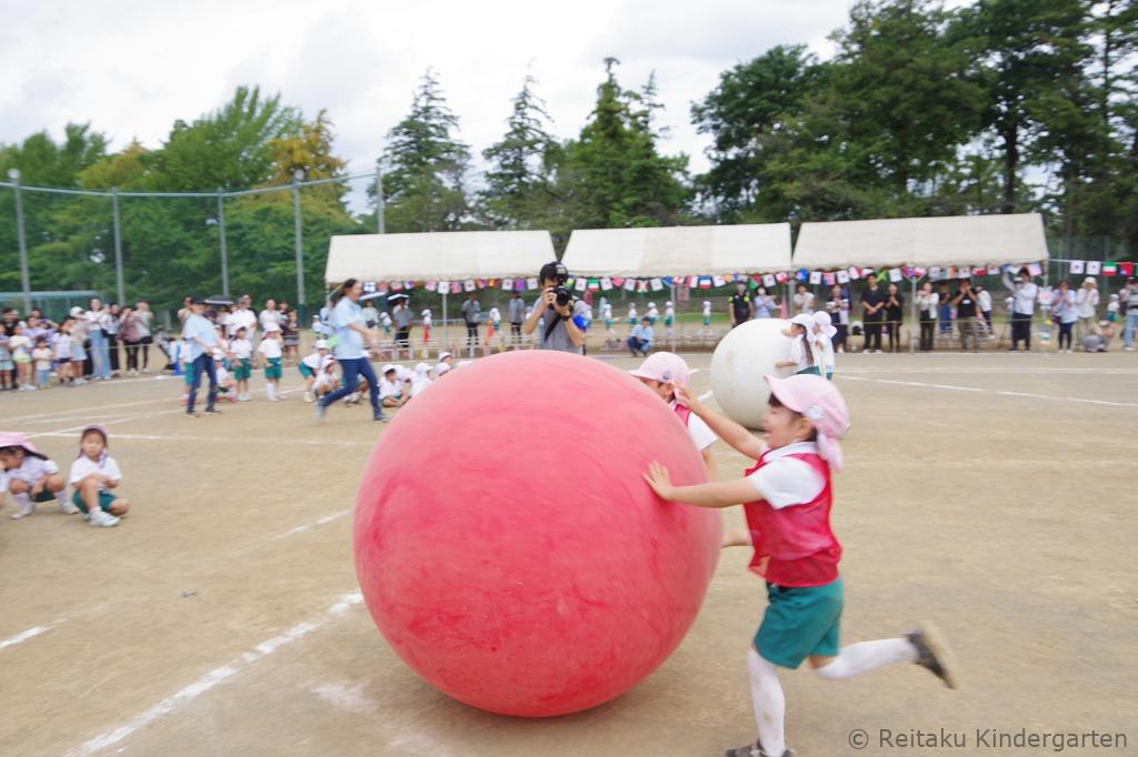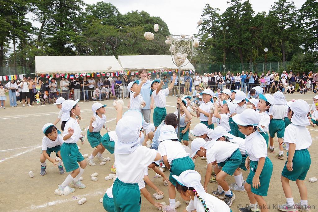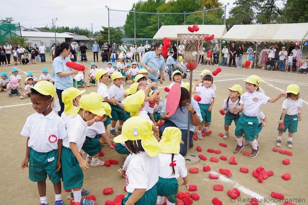 お父さん、お母さん、おじいちゃん、おばあちゃんを始めとして家族の皆さんが応援に駆けつけ、張り切る子ども達。学年ごとにかけっこ、全学年で玉入れ、年少組はお遊戯、年中組はバルーン、大玉転がし、年長組は旗体操とリレー、綱引きが行われました。