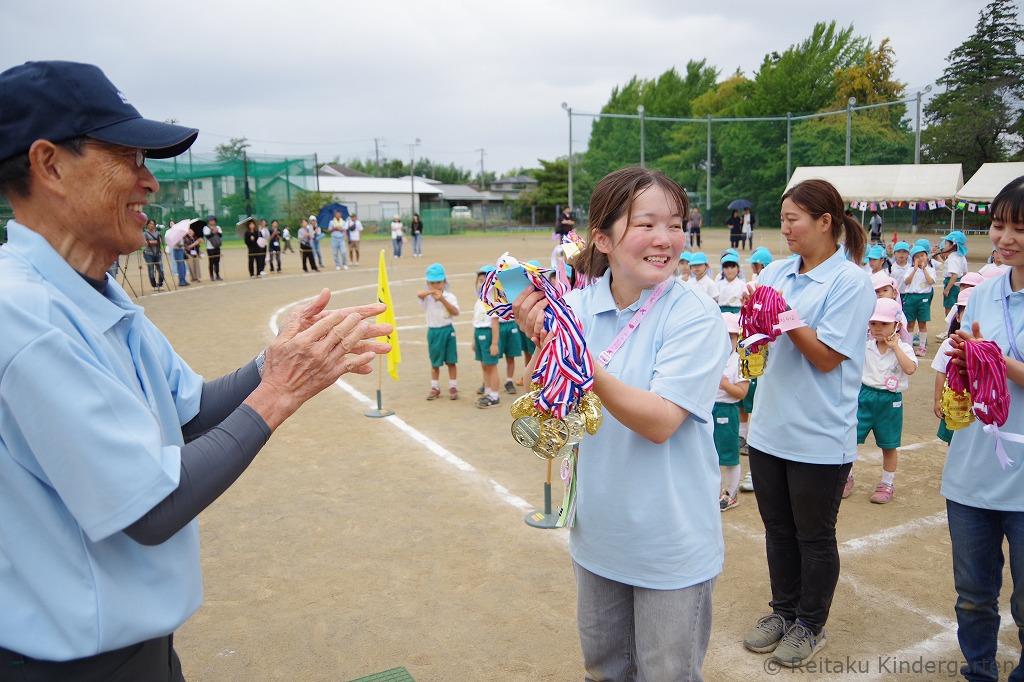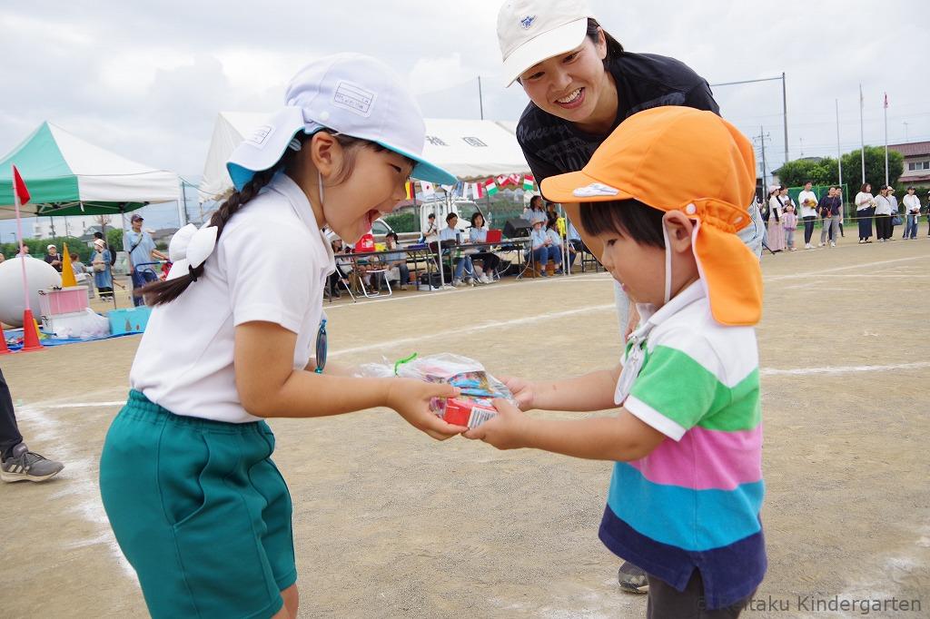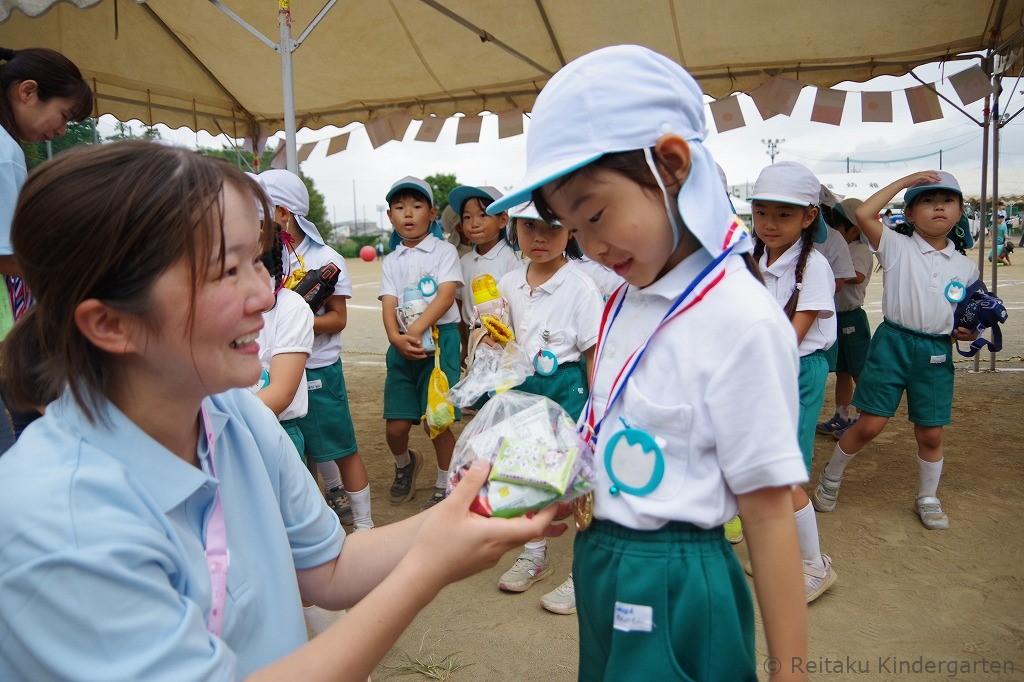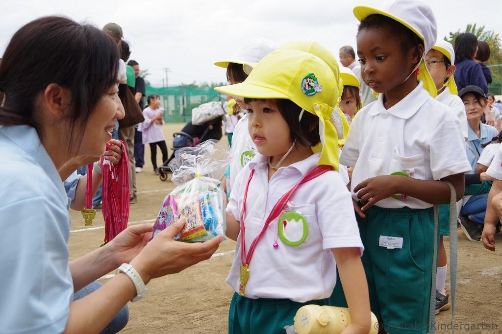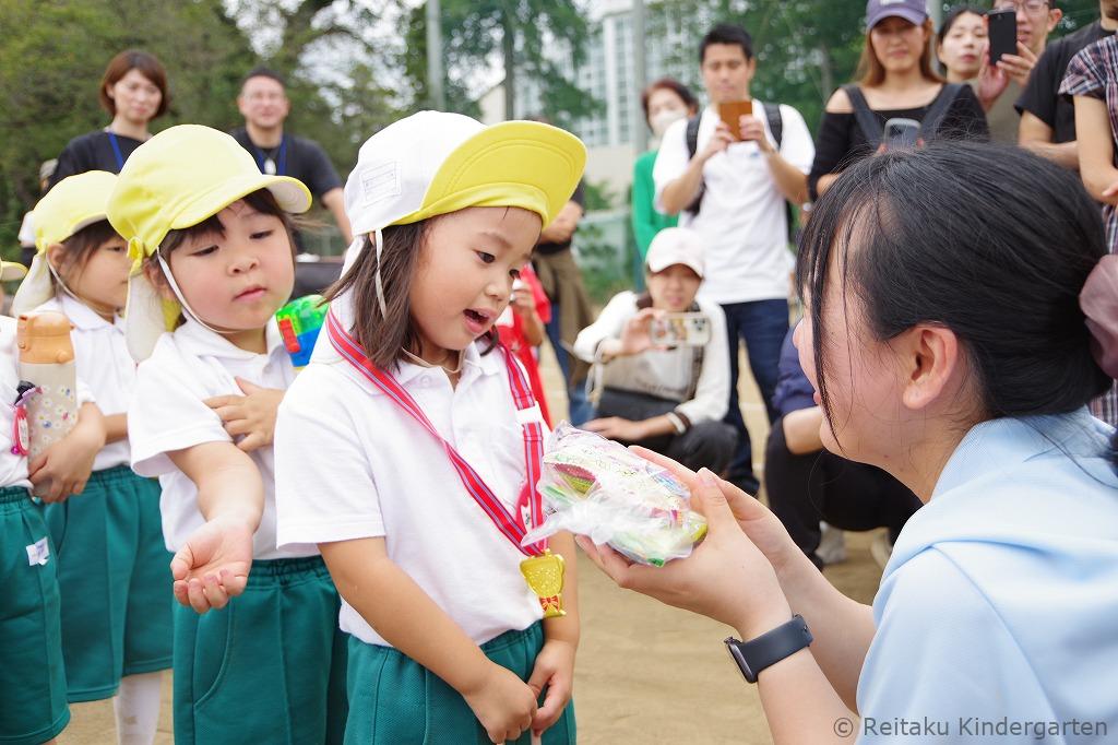 園児たちは、先生より頑張ったご褒美に、全員ピカピカの金メダルをもらってとてもうれしそうでした。どの子も誇らしげに胸にかけて、それぞれ帰宅しました。