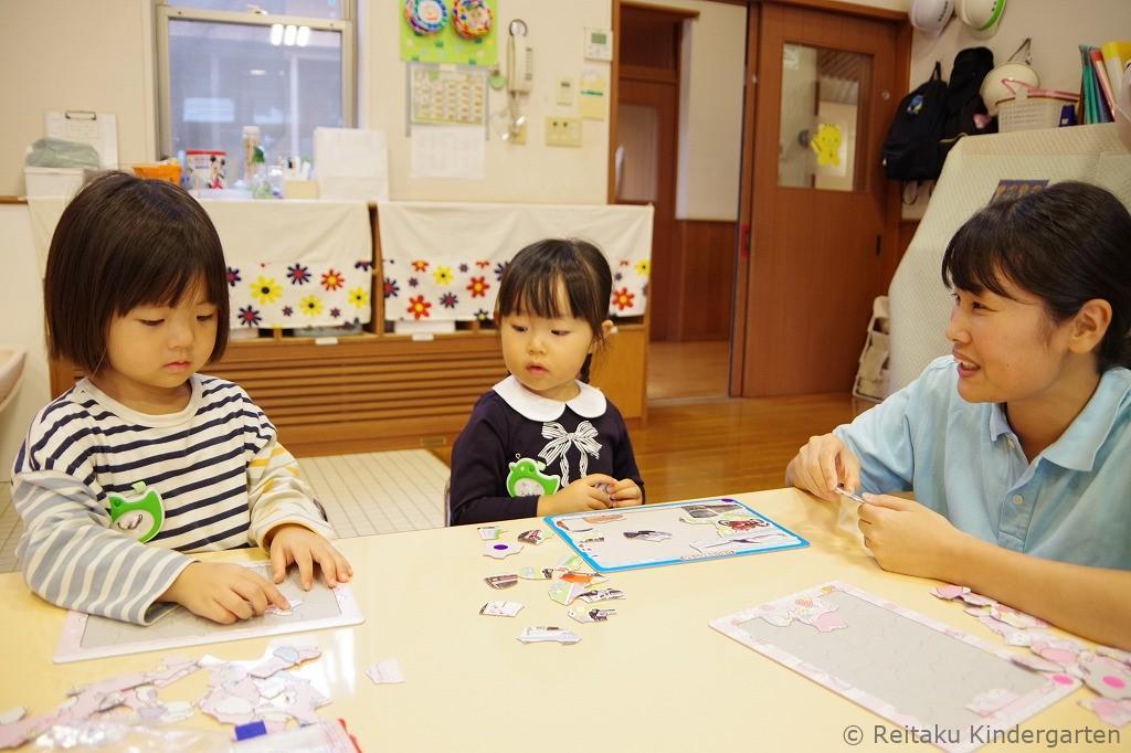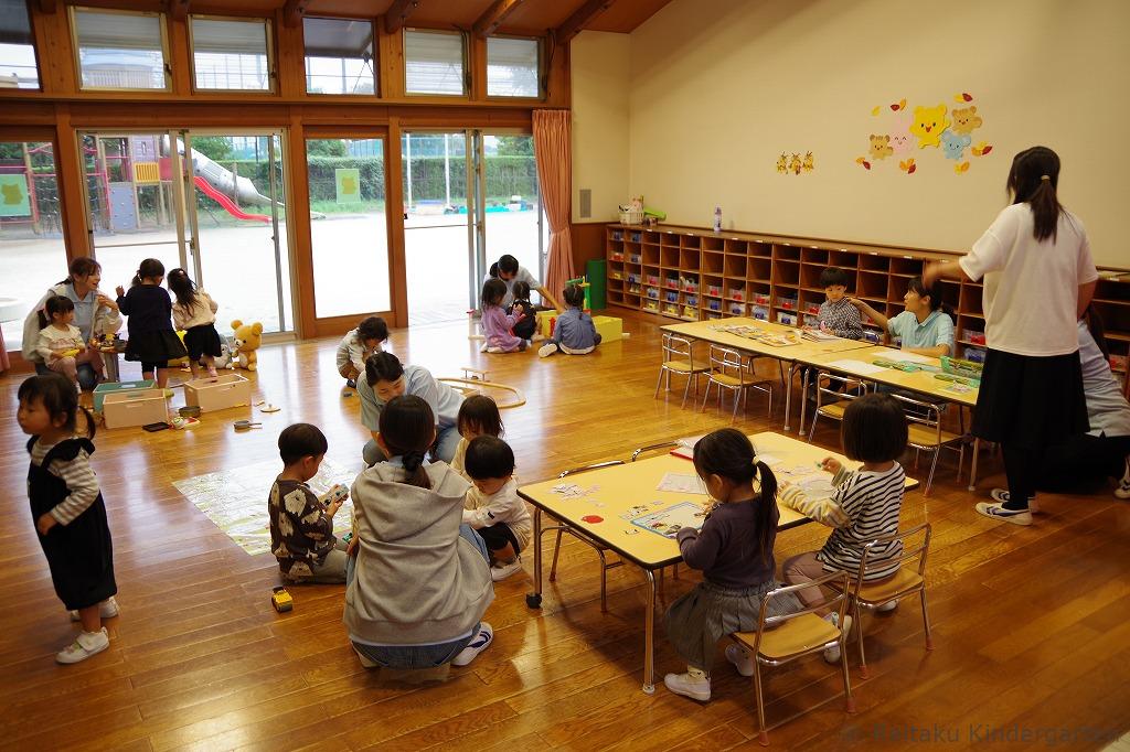 満3歳児の子どもたちは保護者の方々と一緒に説明を聞き、3年保育からの子どもたちは保護者の方が説明を聞いている間、保育室で先生による預かり保育に参加しました。お絵かきをしたり、おもちゃで遊んだりして約1時間の時間を過ごしました。今年は寂しくて泣いてしまう子もおらず、皆楽しく参加する様子がありました。最後まで同室になったおともだちと仲良く過ごすことができました。