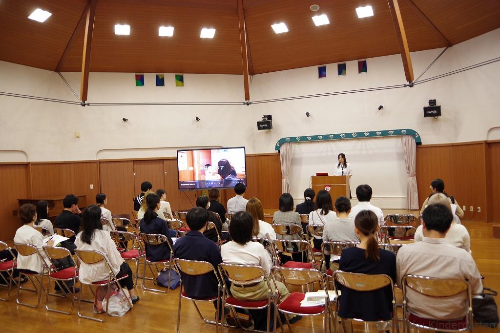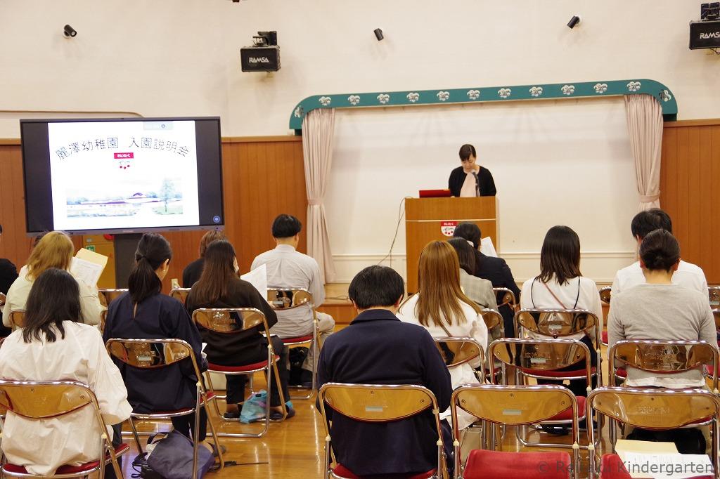保護者の皆さんは、園長の挨拶、一日の保育の流れ、募集案内、受付選考等の説明を熱心にメモを取りながら聞き、スクリーンに映し出される映像を見て、幼稚園での保育の理解を深めました。説明会終了後には、希望者への園内見学もありました。