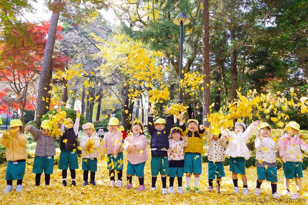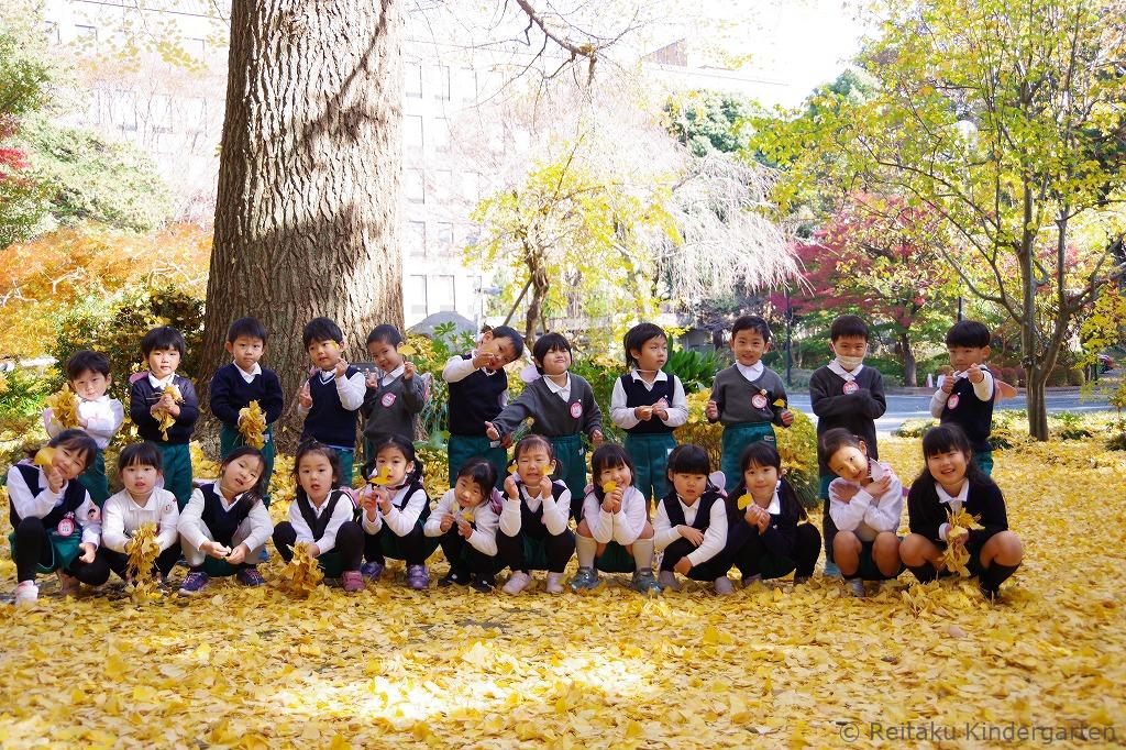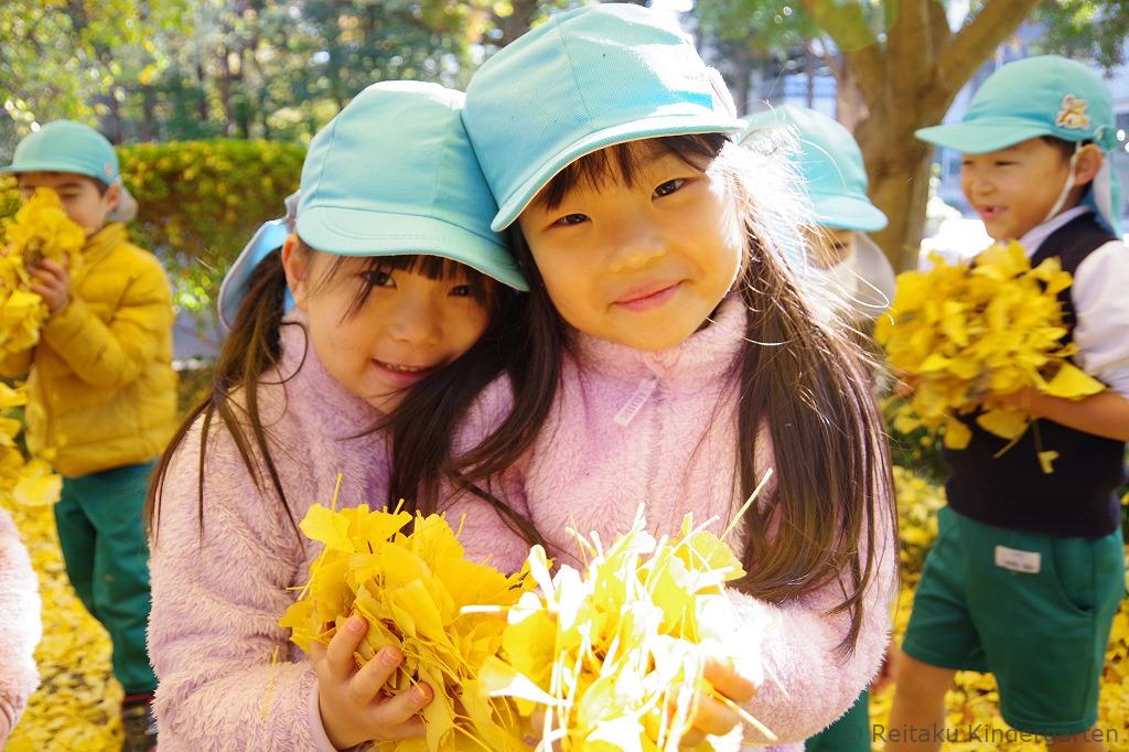 落ち葉や木の実を拾い集めながら、「とってもきれい」「黄色のじゅうたんみたい」「どうして葉っぱの色が赤くなるの?」と話し合う子どもたち。秋の自然を全身で感じるひとときとなりました。