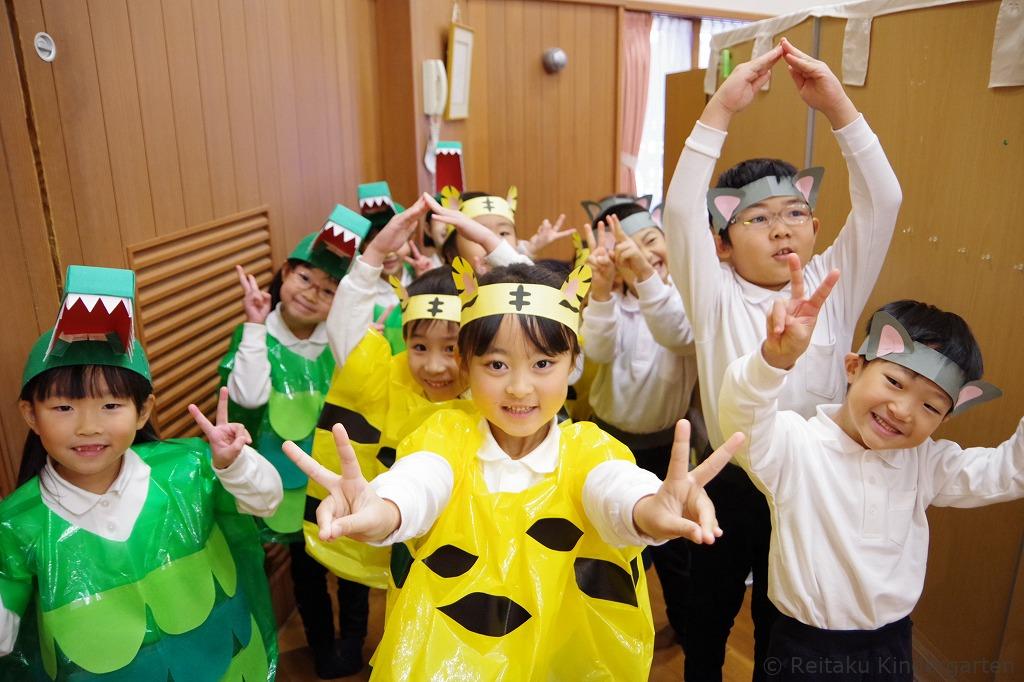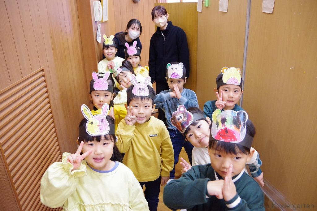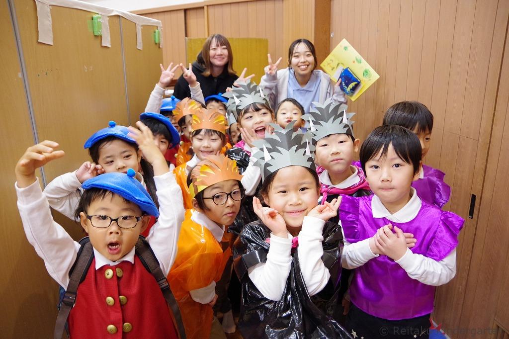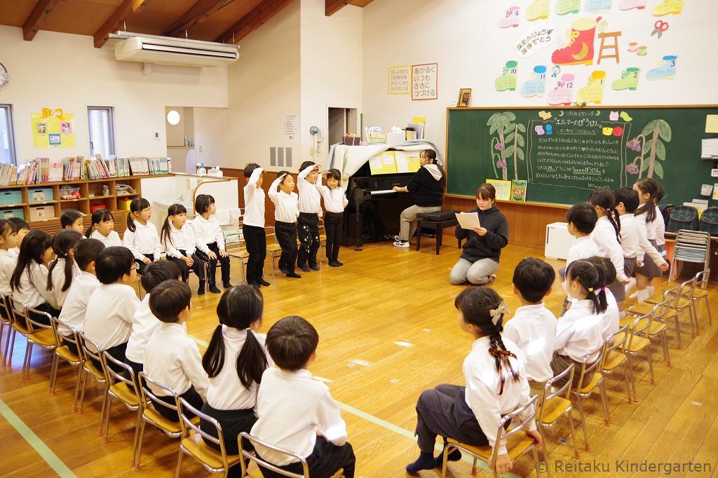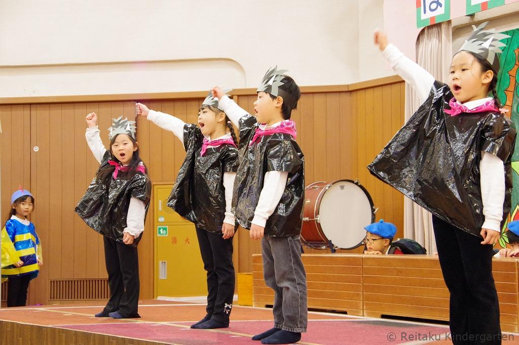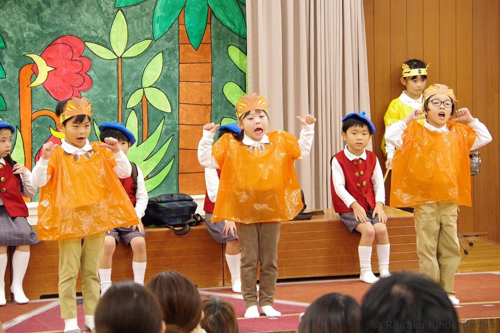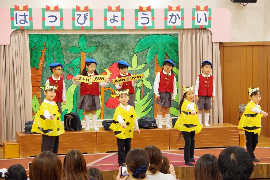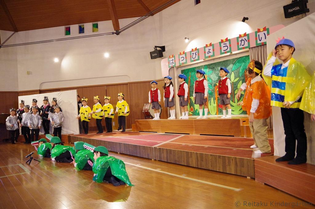 ぱんだ組は「のんびりトレイン」の表現遊び、さくら組は「たからものみつけた!」の劇遊び、つき組は「エルマーの冒険」のオペレッタを発表しました。