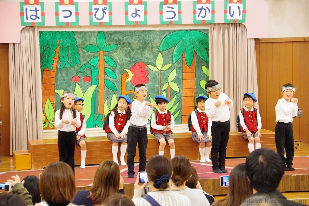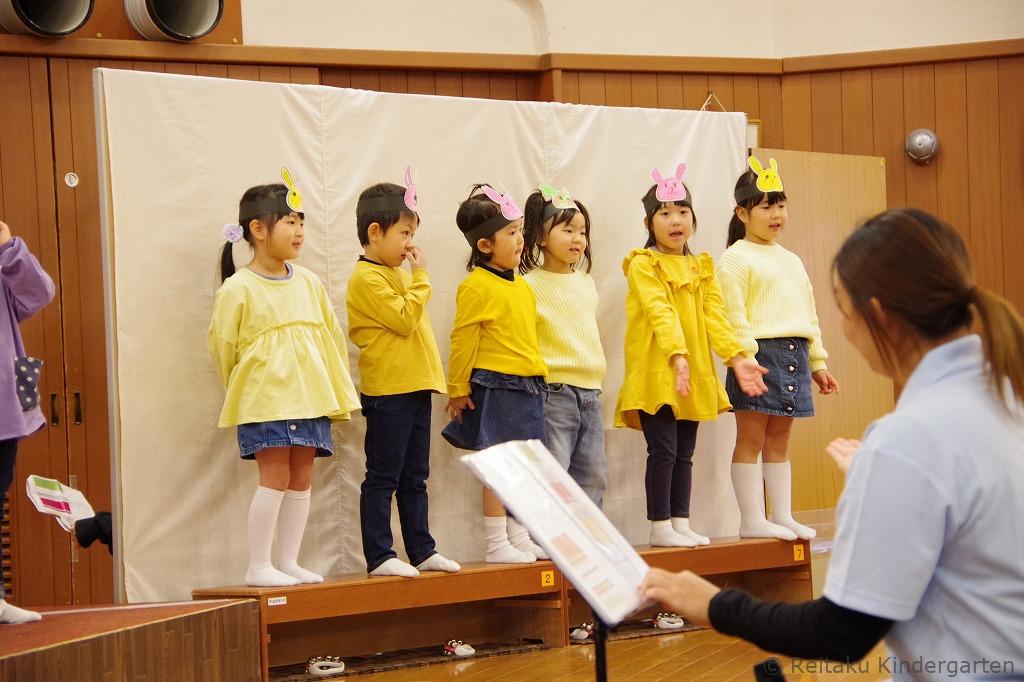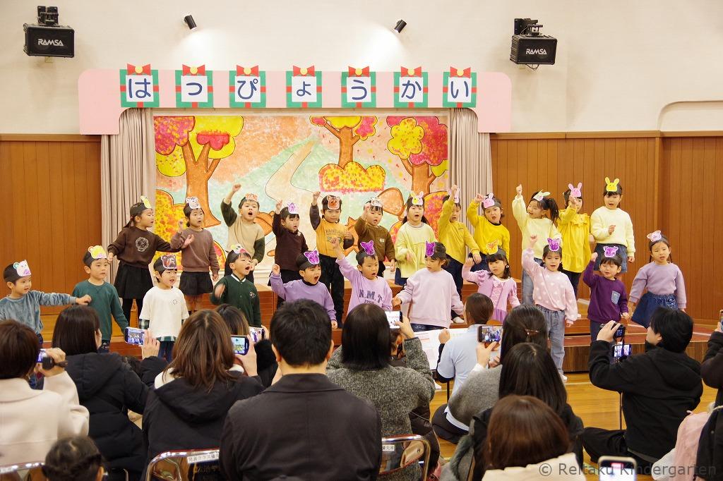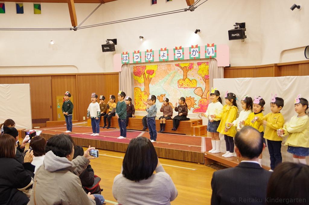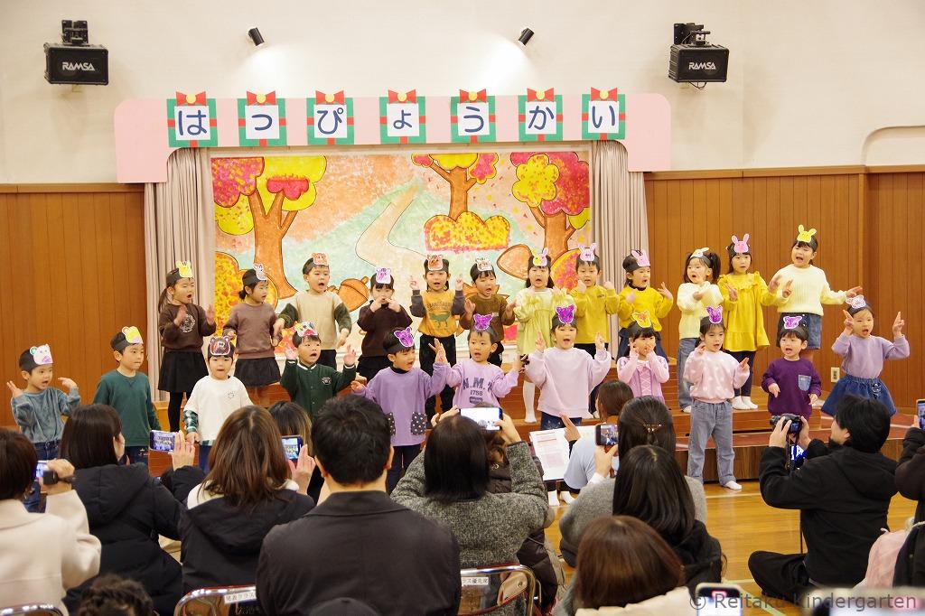 12月7日(日)、昨日に続いて発表会の第2日目が行われました。今日は、ぱんだ組(年少)、さくら組(年中)、つき組(年長)の3クラスが登場し、それぞれのクラスらしい魅力いっぱいの発表を披露してくれました。