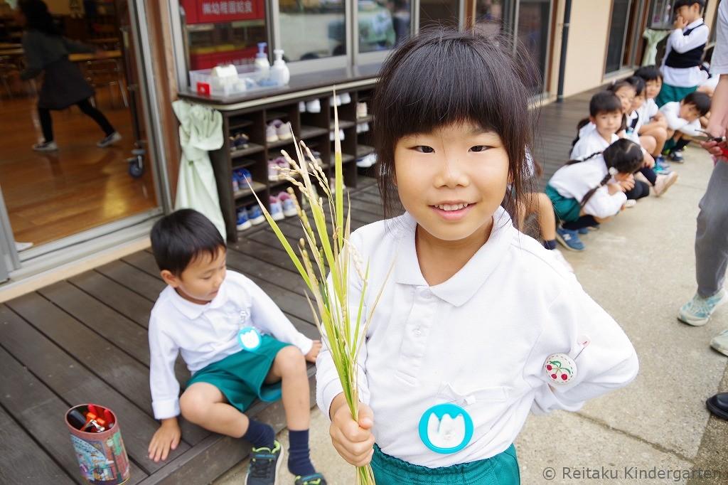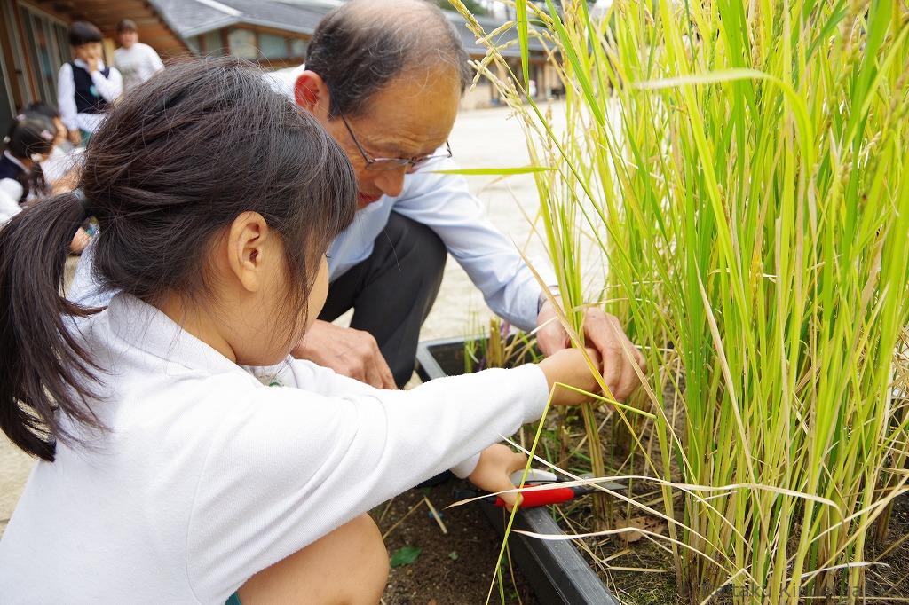 夏の間にぐんぐん育った稲は、秋には立派な黄金色の穂に。子どもたちは自分たちの手で収穫し、脱穀や籾摺りといった作業にも挑戦しました。