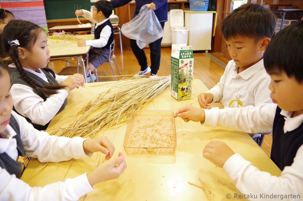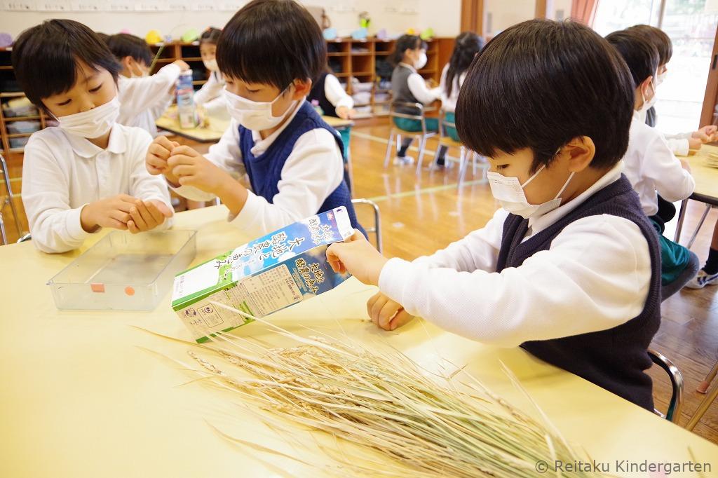 夏の間にぐんぐん育った稲は、秋には立派な黄金色の穂に。子どもたちは自分たちの手で収穫し、脱穀や籾摺りといった作業にも挑戦しました。