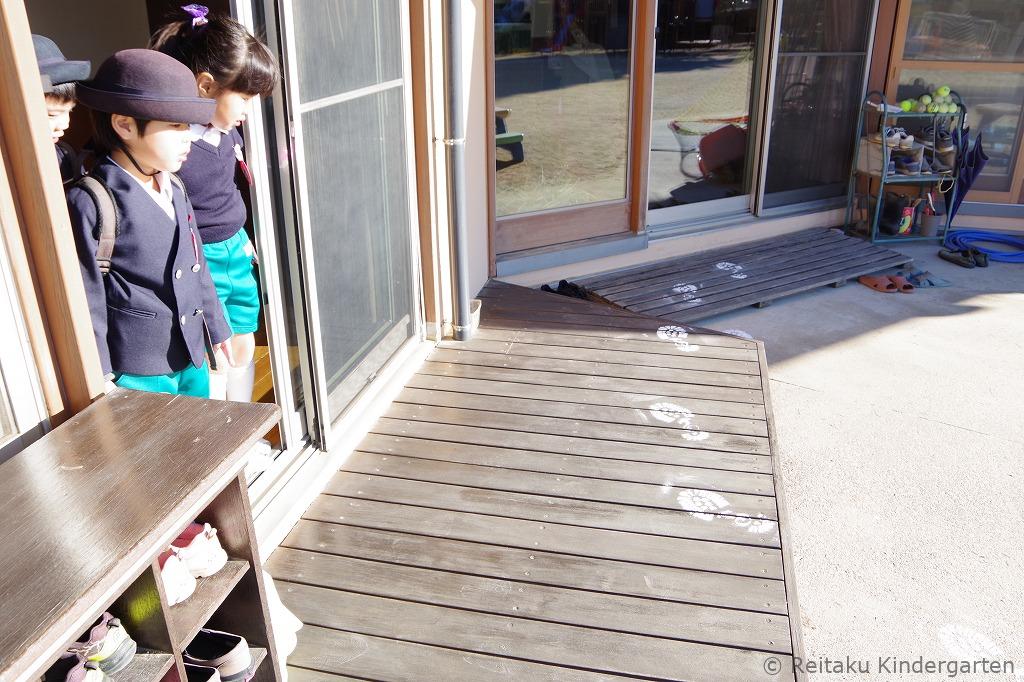 登園してすぐ、テラスには大きな足跡が…!サンタさんとトナカイが来たのかな?と、朝から大興奮の子どもたち。