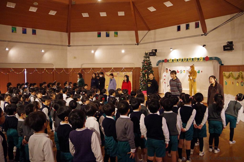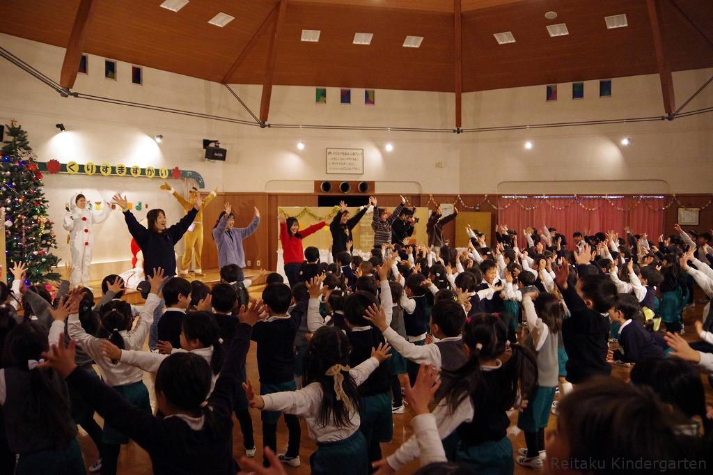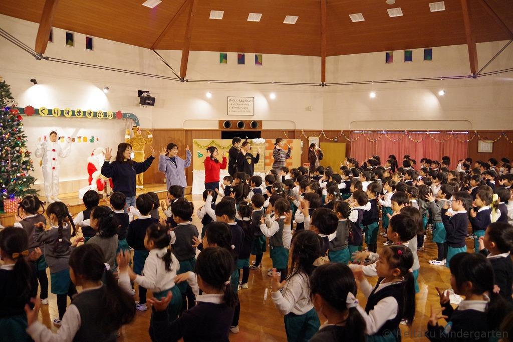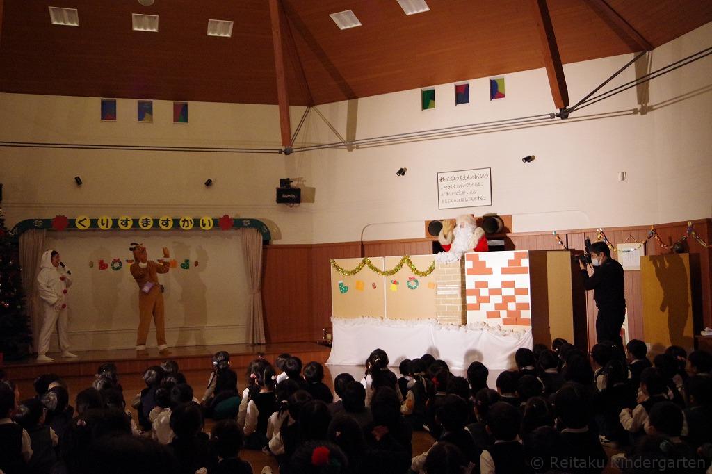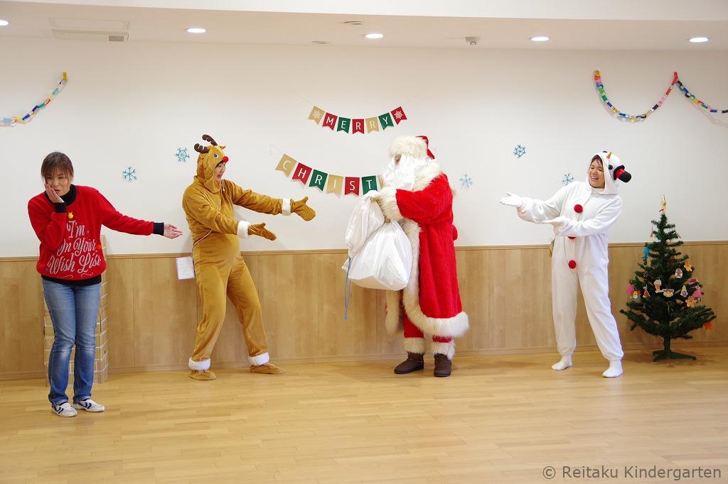 園長先生からクリスマスの由来についてお話を聞いたあと、遊戯室に移動すると、そこにはトナカイの「トナくん」と、雪だるまの「スノーくん」が登場!みんなでクリスマスの歌を歌って楽しんでいると…どこからか鈴の音が聞こえてきて、ついにサンタさんが登場です!