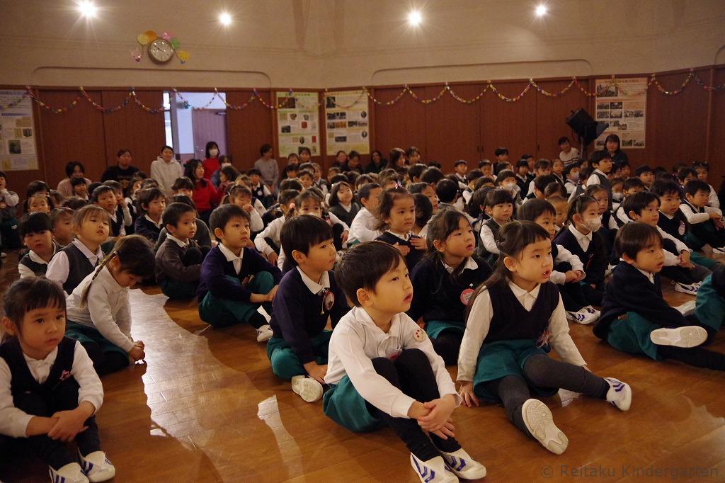 サンタクロースが手を振りながら入ってくると、「サンタさんだー!」と園児たちは大歓声!目を輝かせながら立ち上がり、大喜びの様子でした。