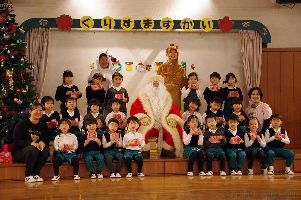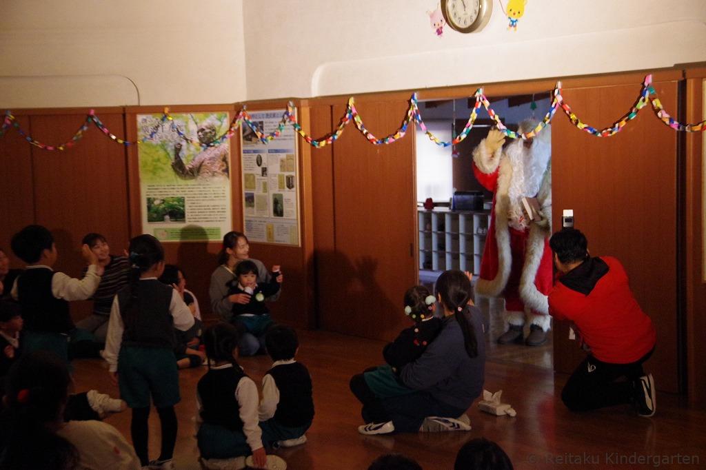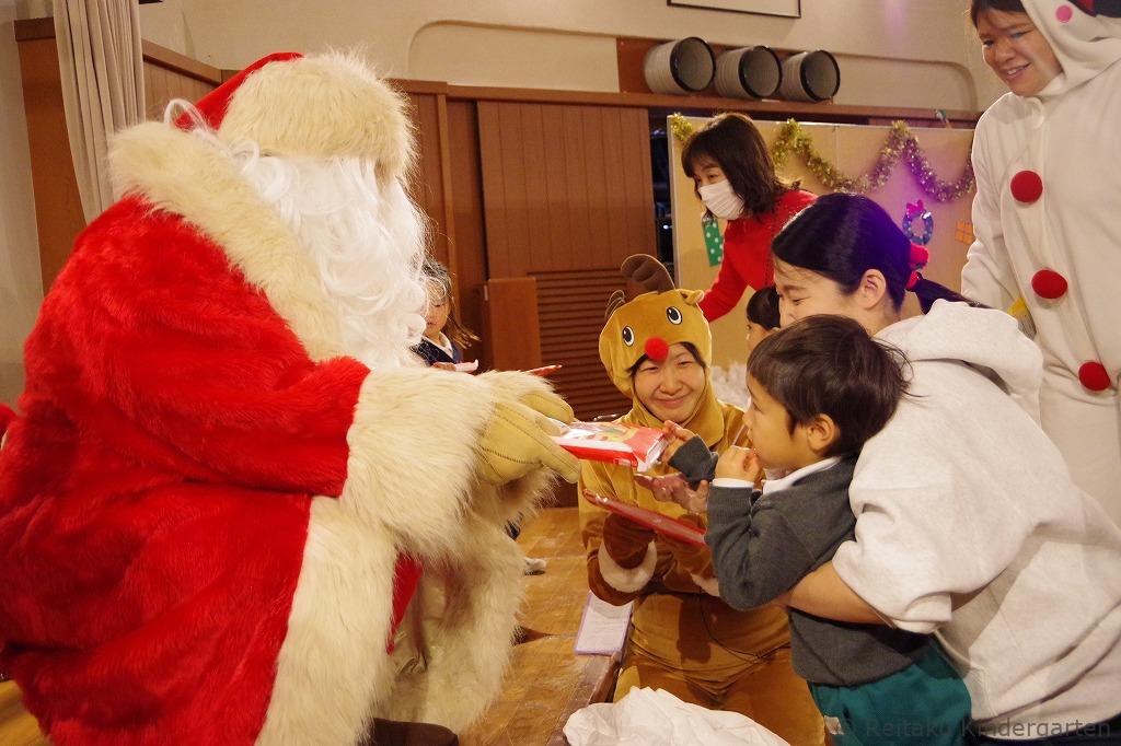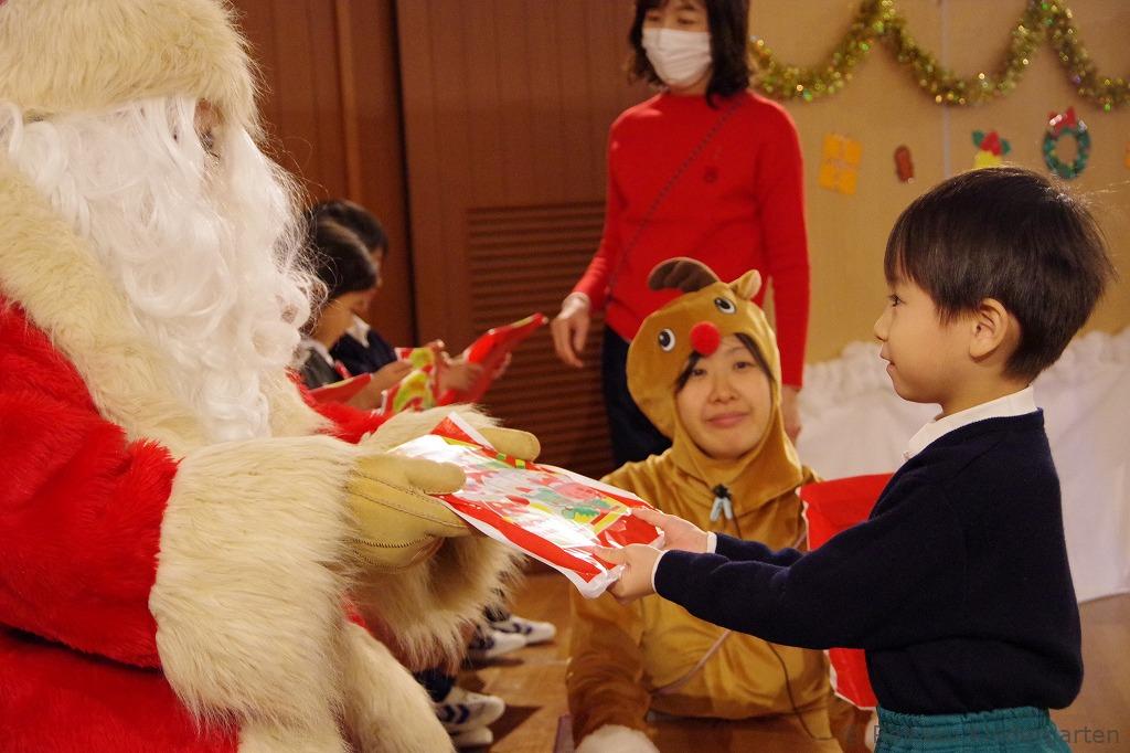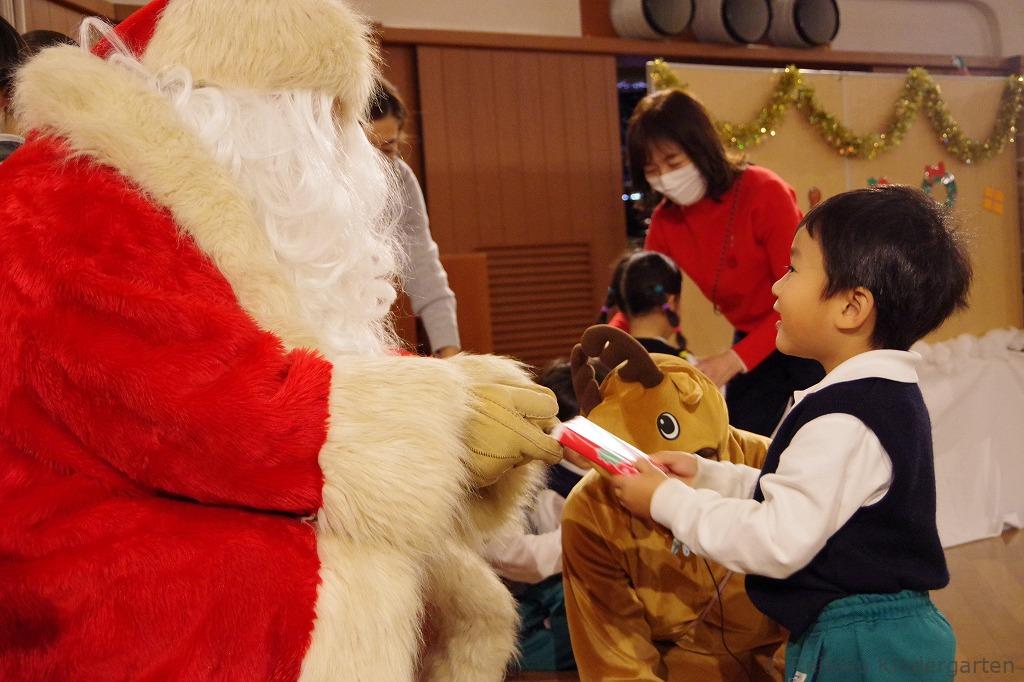 クラスごとに、サンタさんに聞いてみたかった質問をインタビューしたり、やさしく答えてくれる姿に笑顔があふれました。そして、いよいよ待ちに待ったプレゼントの時間。ひとりひとりサンタさんから手渡しでプレゼントを受け取り、クラスごとに記念写真も撮りました。