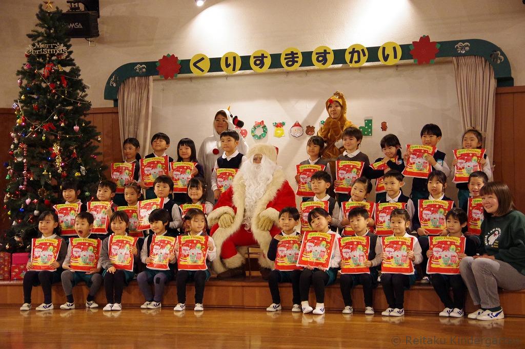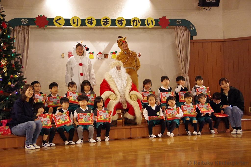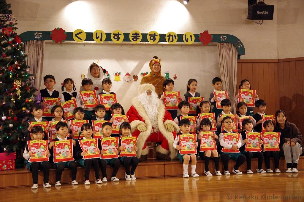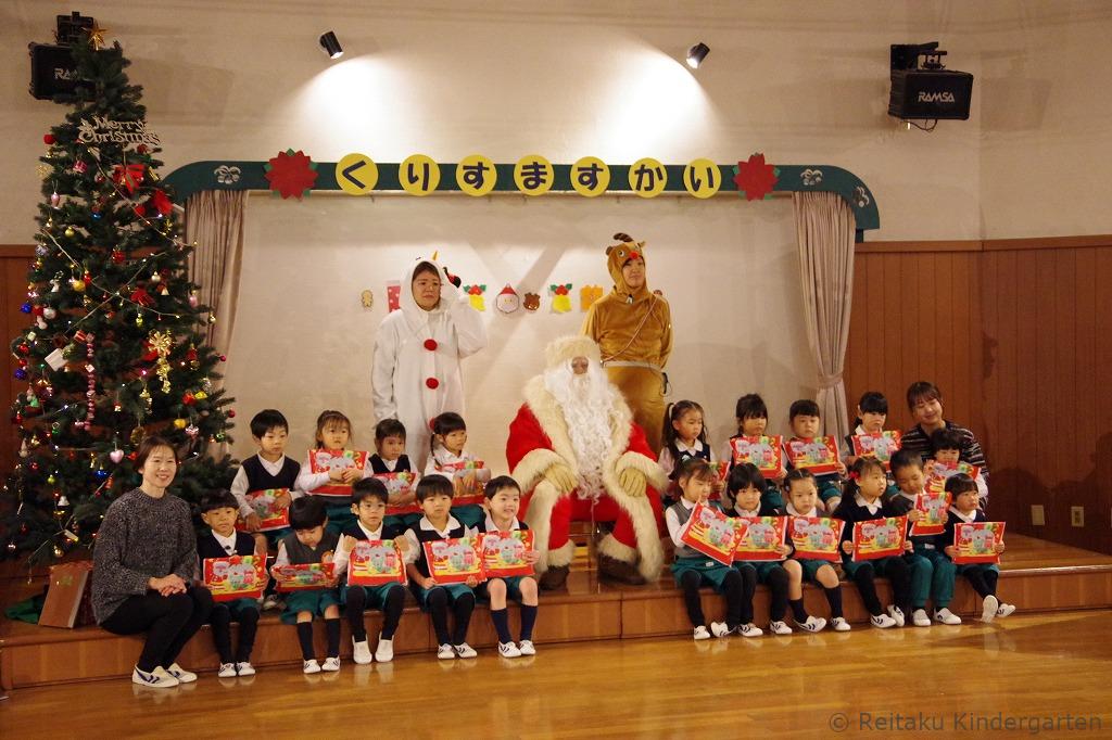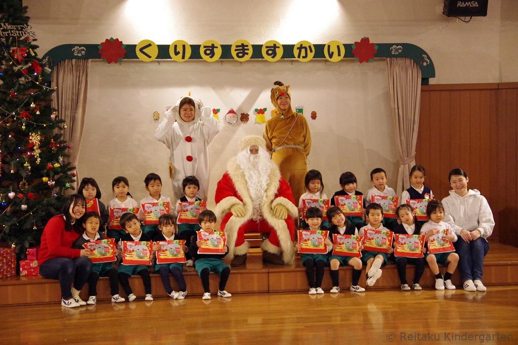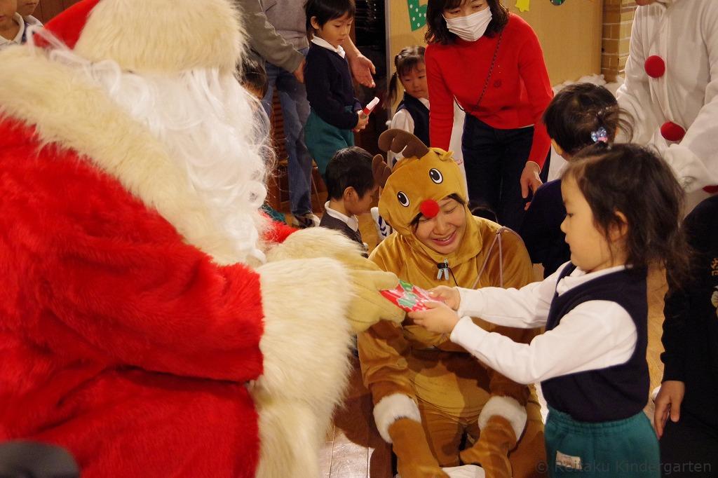 クラスごとに、サンタさんに聞いてみたかった質問をインタビューしたり、やさしく答えてくれる姿に笑顔があふれました。そして、いよいよ待ちに待ったプレゼントの時間。ひとりひとりサンタさんから手渡しでプレゼントを受け取り、クラスごとに記念写真も撮りました。