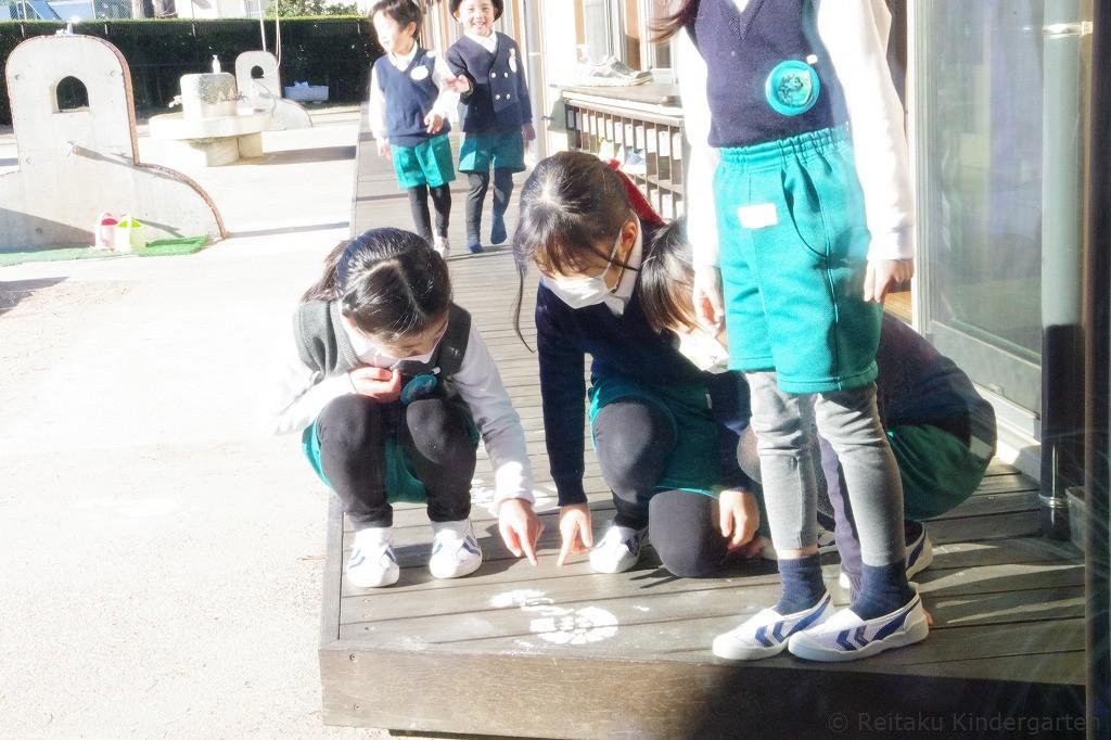 登園してすぐ、テラスには大きな足跡が…!サンタさんとトナカイが来たのかな?と、朝から大興奮の子どもたち。