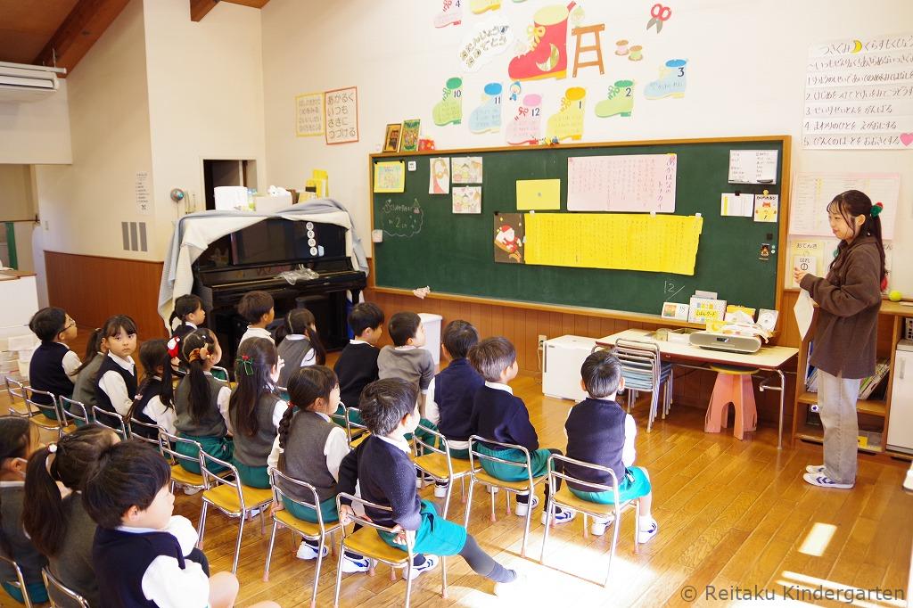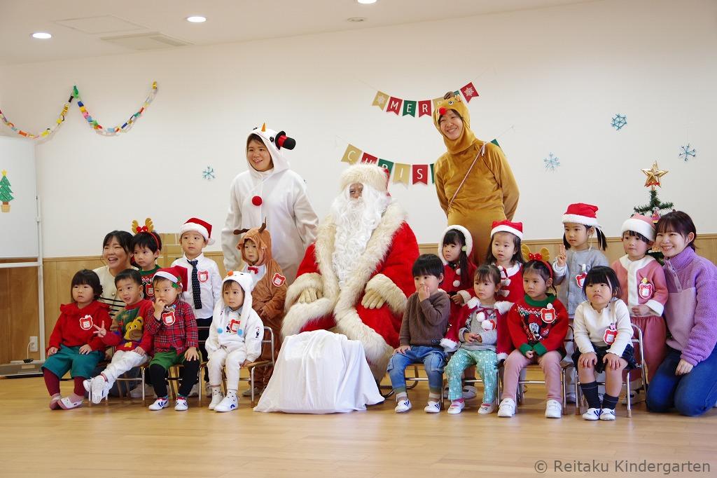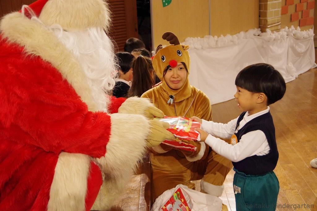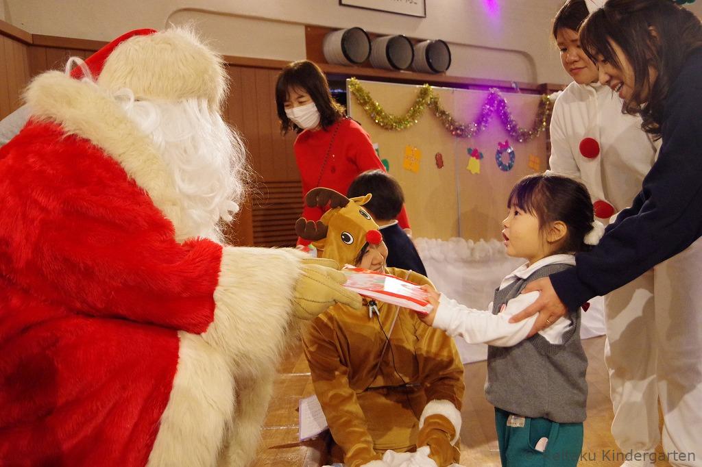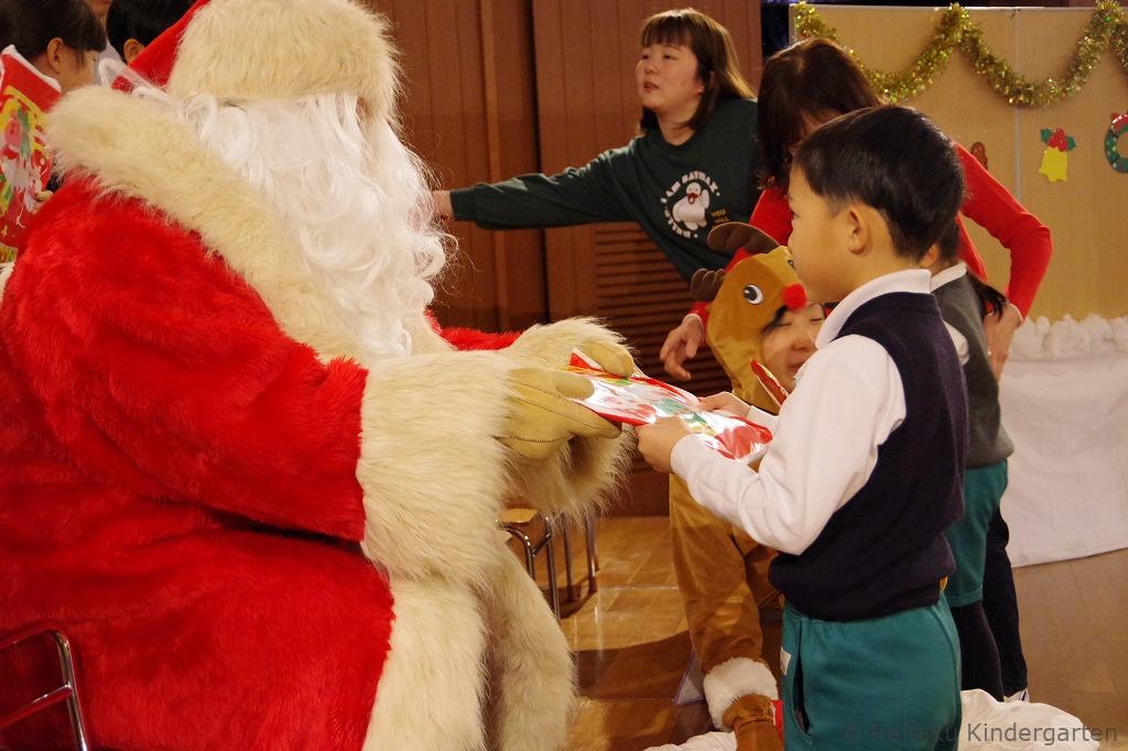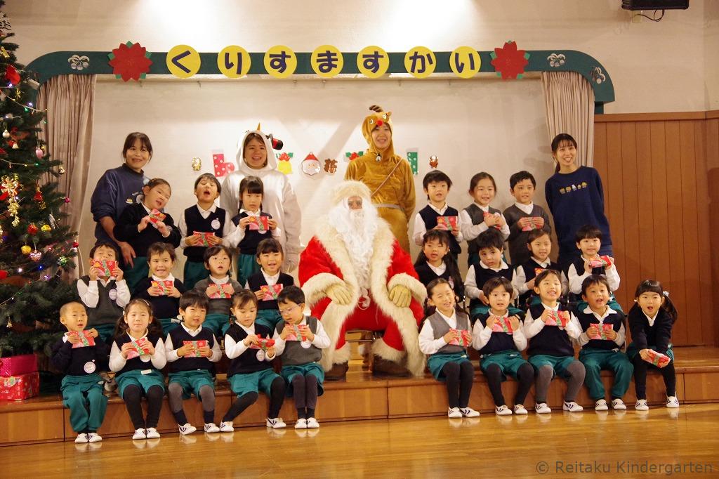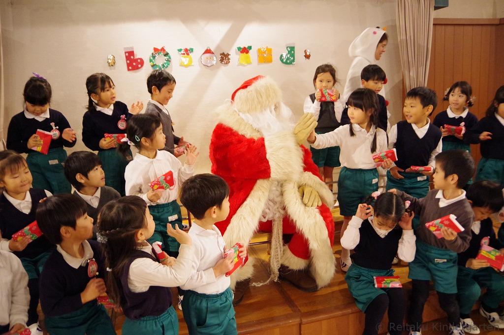 クラスごとに、サンタさんに聞いてみたかった質問をインタビューしたり、やさしく答えてくれる姿に笑顔があふれました。そして、いよいよ待ちに待ったプレゼントの時間。ひとりひとりサンタさんから手渡しでプレゼントを受け取り、クラスごとに記念写真も撮りました。