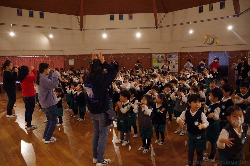園長先生からクリスマスの由来についてお話を聞いたあと、遊戯室に移動すると、そこにはトナカイの「トナくん」と、雪だるまの「スノーくん」が登場!みんなでクリスマスの歌を歌って楽しんでいると…どこからか鈴の音が聞こえてきて、ついにサンタさんが登場です!