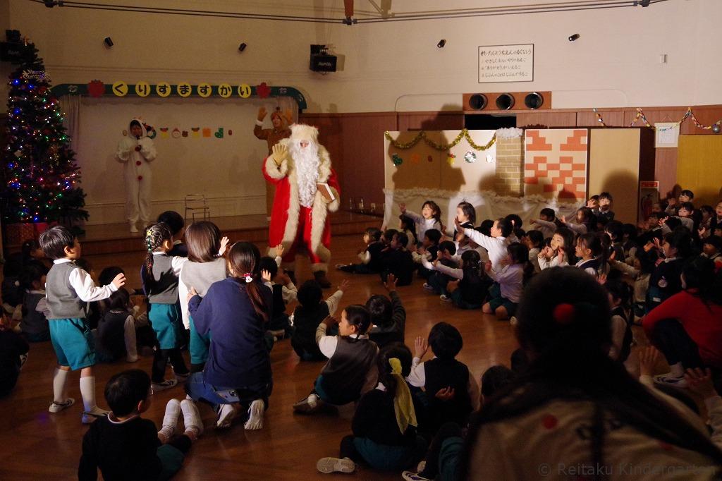サンタクロースが手を振りながら入ってくると、「サンタさんだー!」と園児たちは大歓声!目を輝かせながら立ち上がり、大喜びの様子でした。