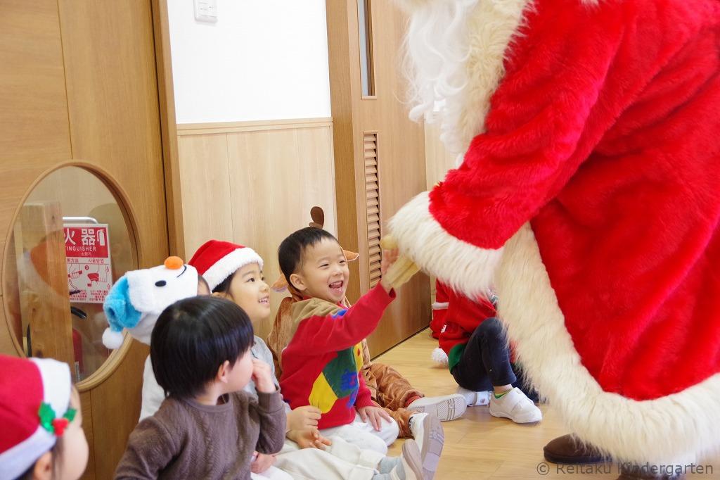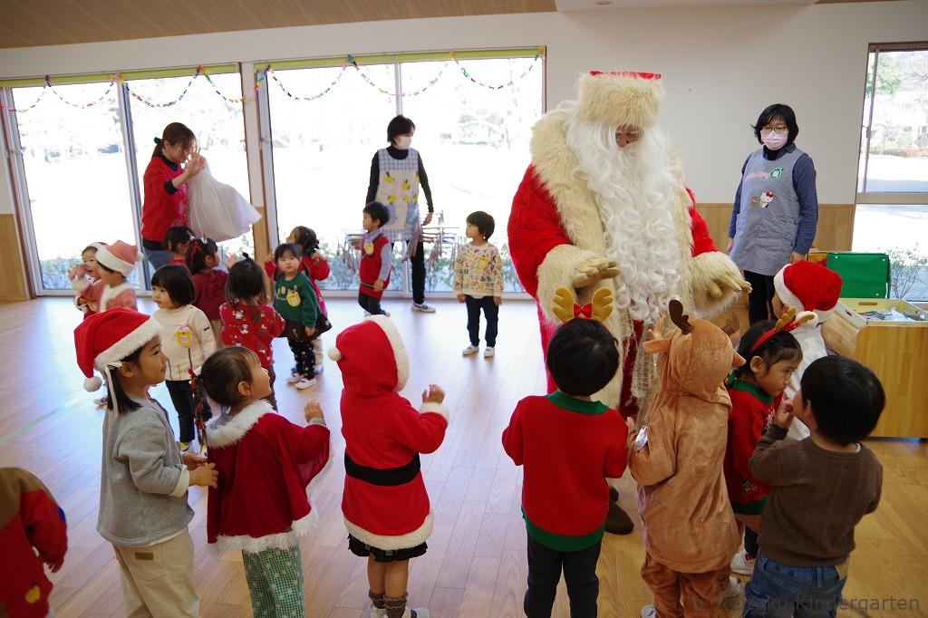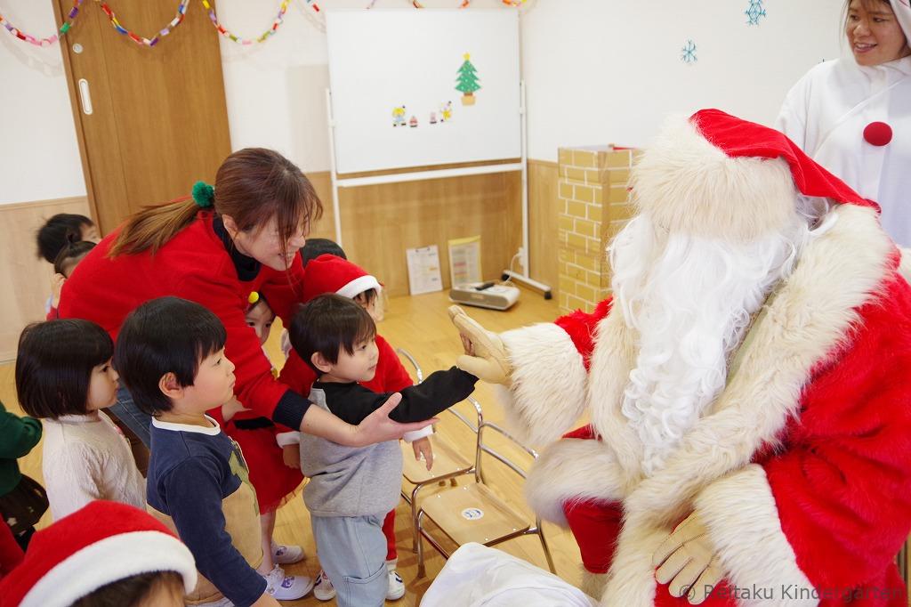その後、満3歳児クラスのお友だちのところにもサンタさんが来てくれて、目をキラキラ輝かせながら大喜びの子どもたち。思い出に残る素敵な一日となりました。