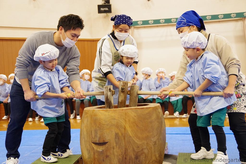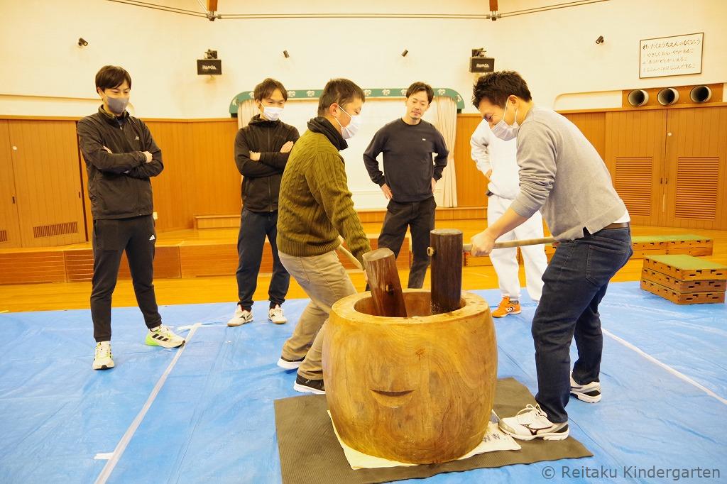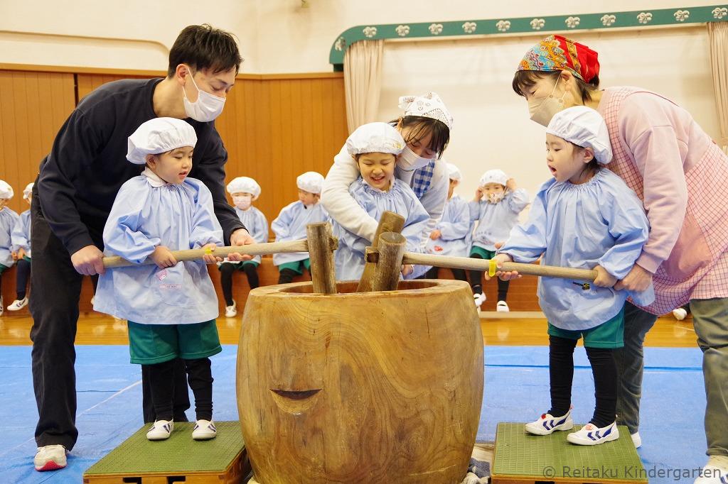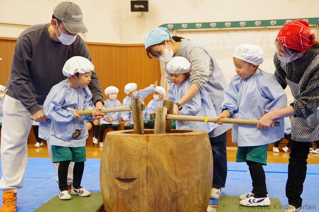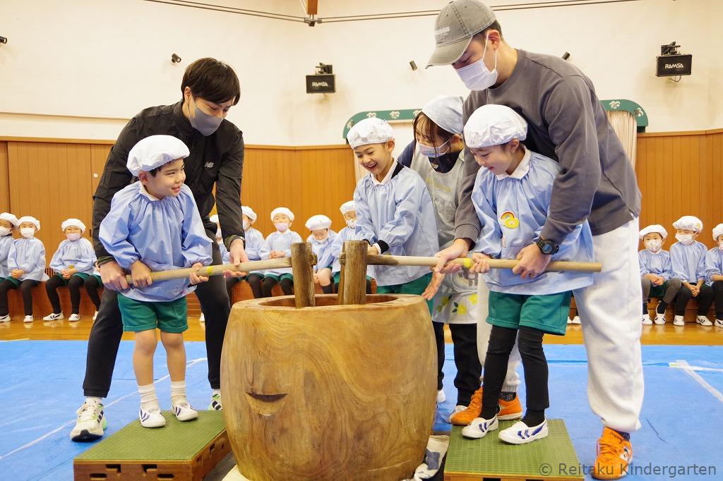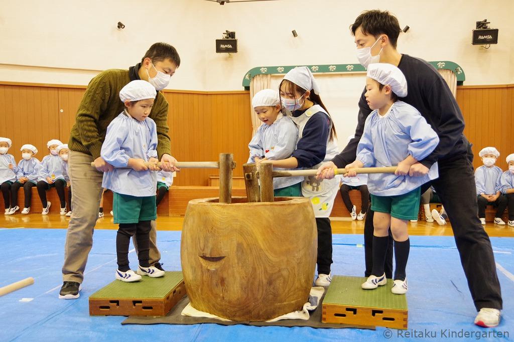 年少・年中・年長組の子どもたちは遊戯室にて、先生やお手伝いのお父さんたちと一緒に、元気いっぱいもちつきを体験しました。