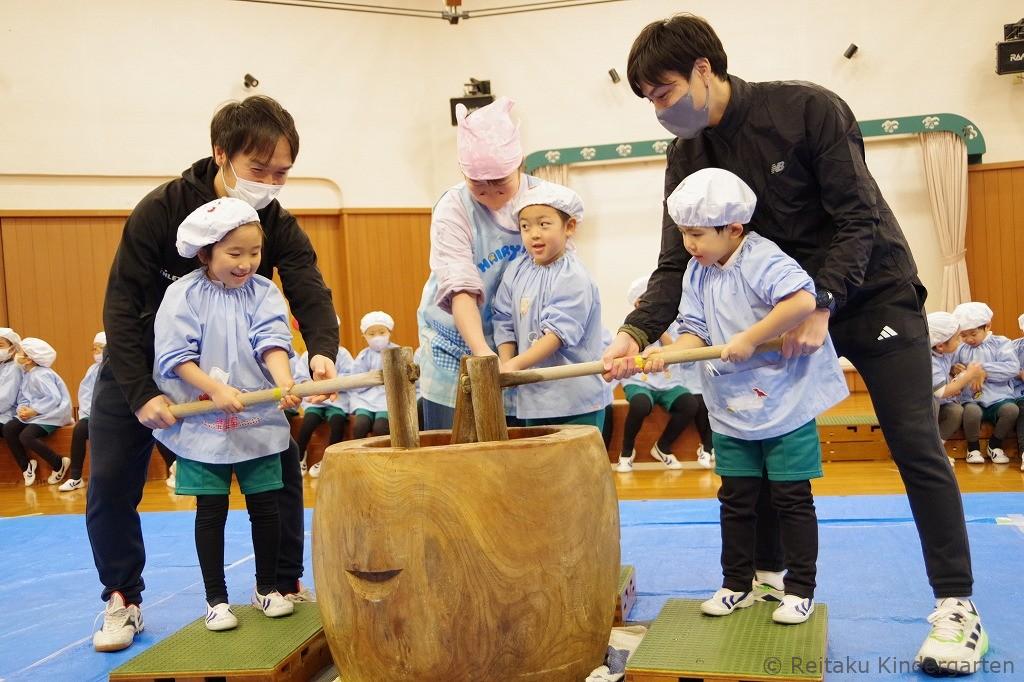 目の前で先生やお父さんたちがつく本格的な餅つきの様子を「よいしょ!よいしょ!」の掛け声とともに見守り、いよいよ自分たちの番。杵をしっかり持ち、「よいしょ!」のリズムで力強くおもちをつく姿はとても頼もしく感じられました。