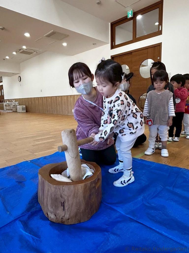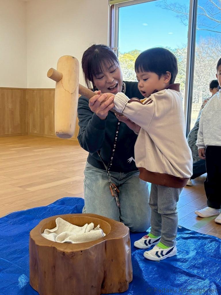 目の前で先生やお父さんたちがつく本格的な餅つきの様子を「よいしょ!よいしょ!」の掛け声とともに見守り、いよいよ自分たちの番。杵をしっかり持ち、「よいしょ!」のリズムで力強くおもちをつく姿はとても頼もしく感じられました。