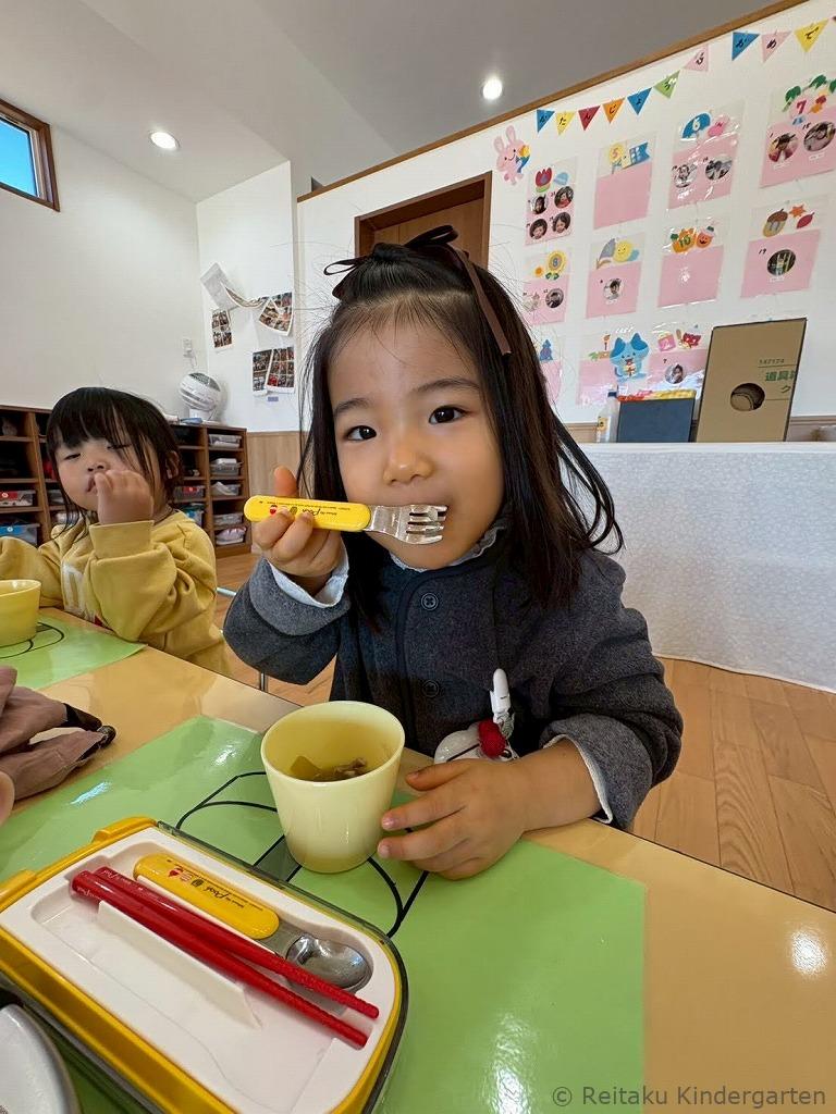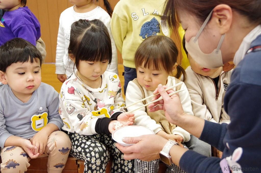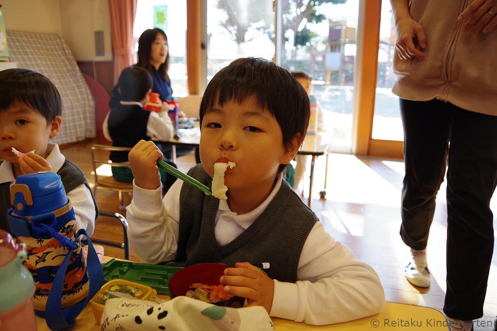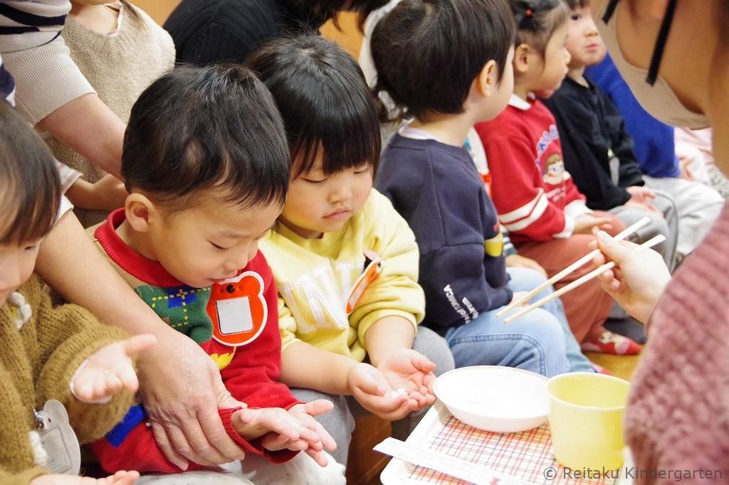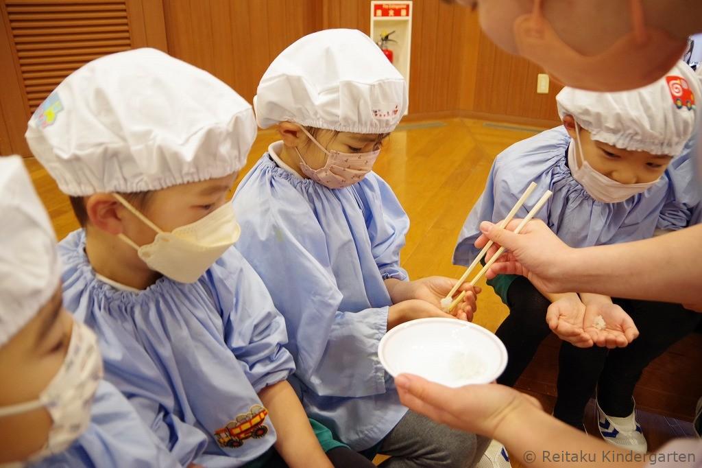 「びよーんって伸びるよ!」「おいしい〜!」と感動しながら、何度もおかわりをする子も。おもちが苦手だった子も、自分たちでついた特別なおもちは格別だったようで、にこにこしながら味わっていました。