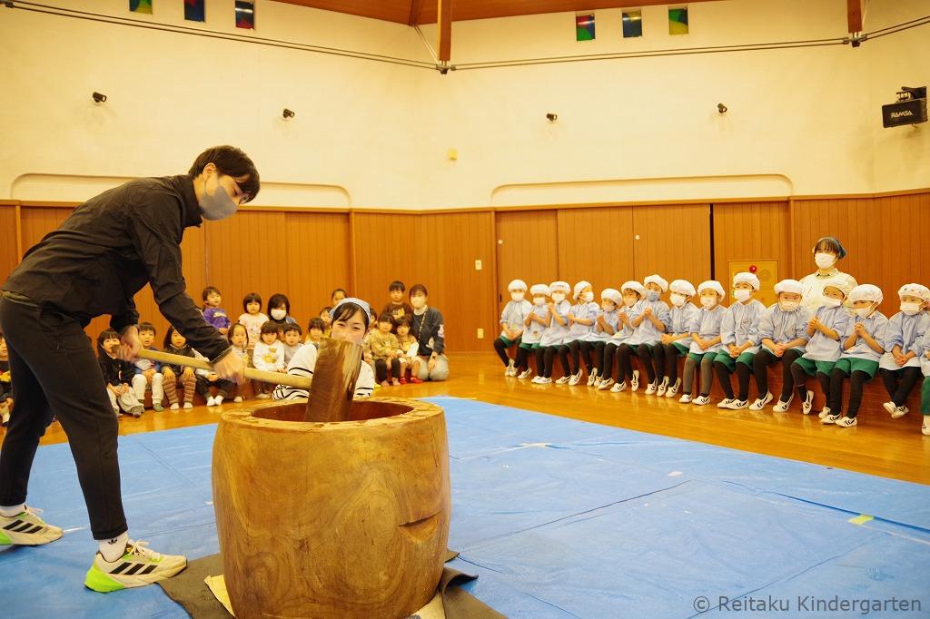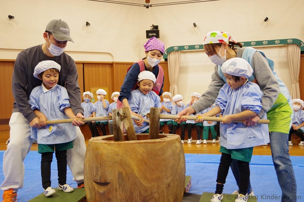 年少・年中・年長組の子どもたちは遊戯室にて、先生やお手伝いのお父さんたちと一緒に、元気いっぱいもちつきを体験しました。