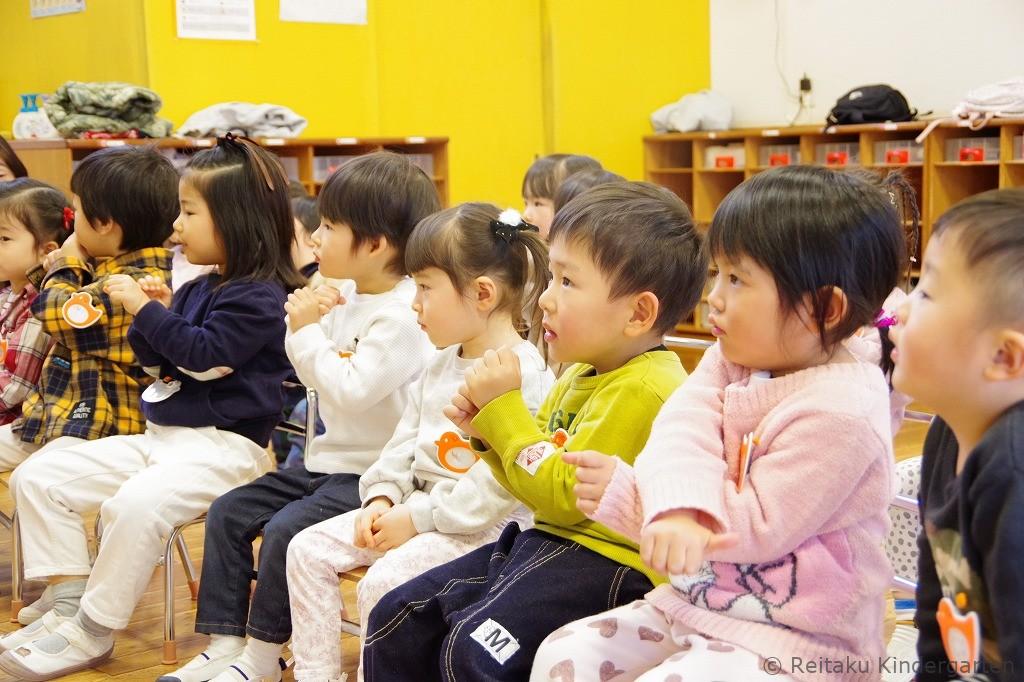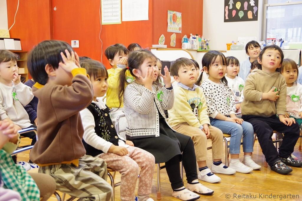 保護者の皆さまには、お子さまと別れて遊戯室にて「入園にあたって」の説明を聞いていただきました。その間、子どもたちは保育室で先生やお友だちと一緒に、チューリップの歌を歌ったり、リズム遊びやパネルシアターを見たりしながら、楽しい時間を過ごしました。はじめはお母さんを探して涙を流していた子も、次第に泣き止み、活動に参加する姿が見られました。