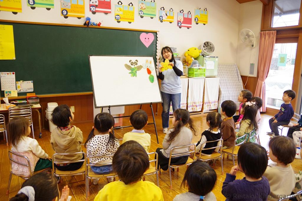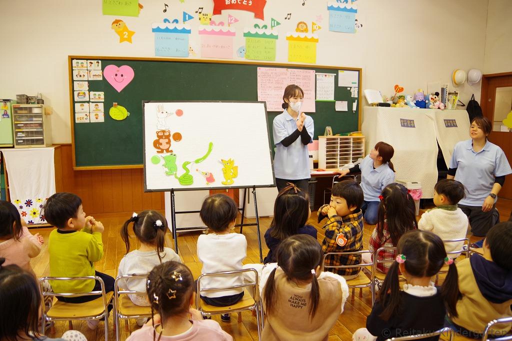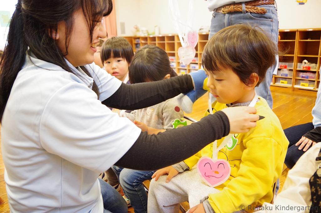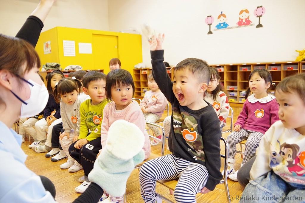 保護者の皆さまには、お子さまと別れて遊戯室にて「入園にあたって」の説明を聞いていただきました。その間、子どもたちは保育室で先生やお友だちと一緒に、チューリップの歌を歌ったり、リズム遊びやパネルシアターを見たりしながら、楽しい時間を過ごしました。はじめはお母さんを探して涙を流していた子も、次第に泣き止み、活動に参加する姿が見られました。