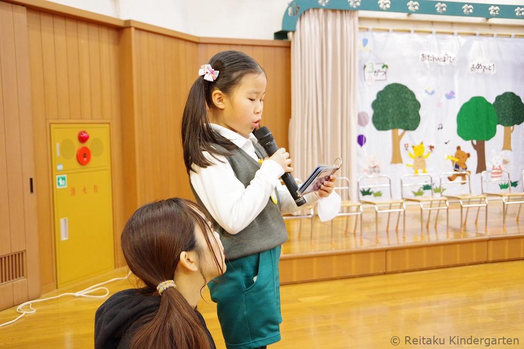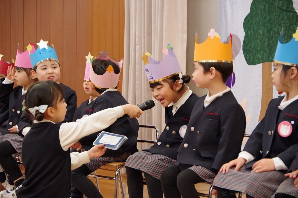 司会は年長組が担当しました。インタビューでは、年少児の誕生児には「好きな動物は何ですか」、年中児には「幼稚園で好きな遊びは何ですか」、年長児には「大きくなったら何になりたいですか」などの質問がありました。