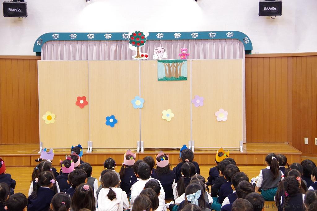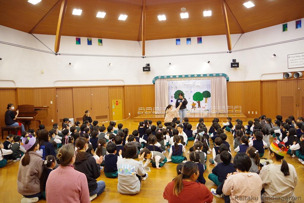 今月のお楽しみは、先生たちによるパペット劇でした。先生たちが登場すると、子どもたちは大喜び。遊戯室は楽しい雰囲気に包まれました。