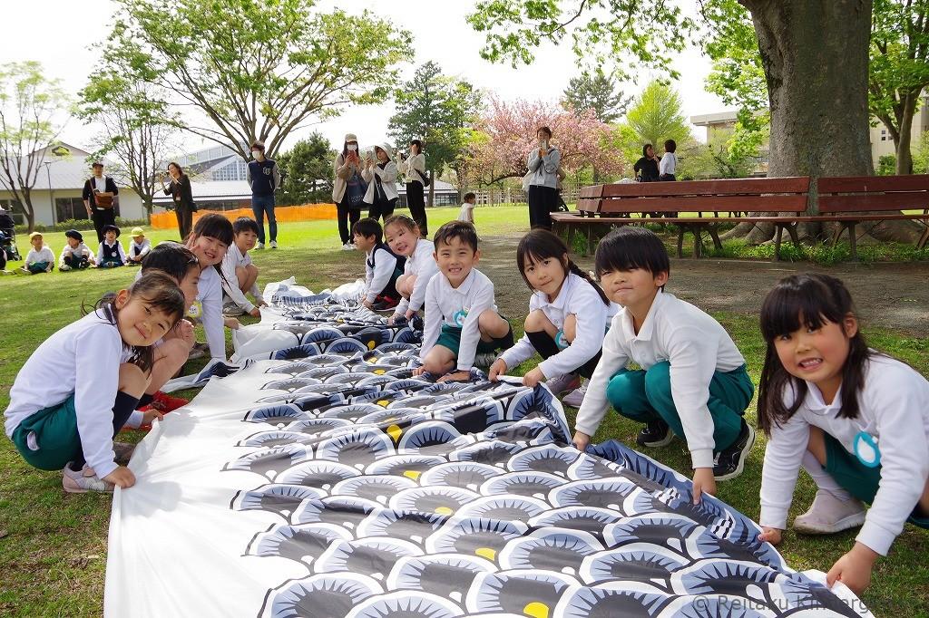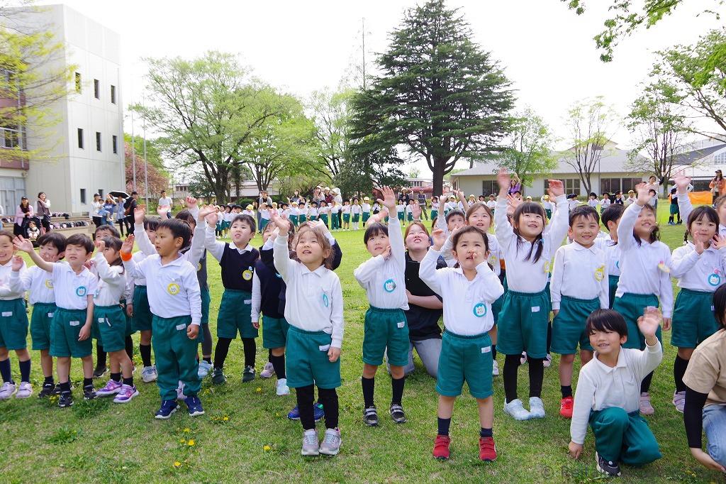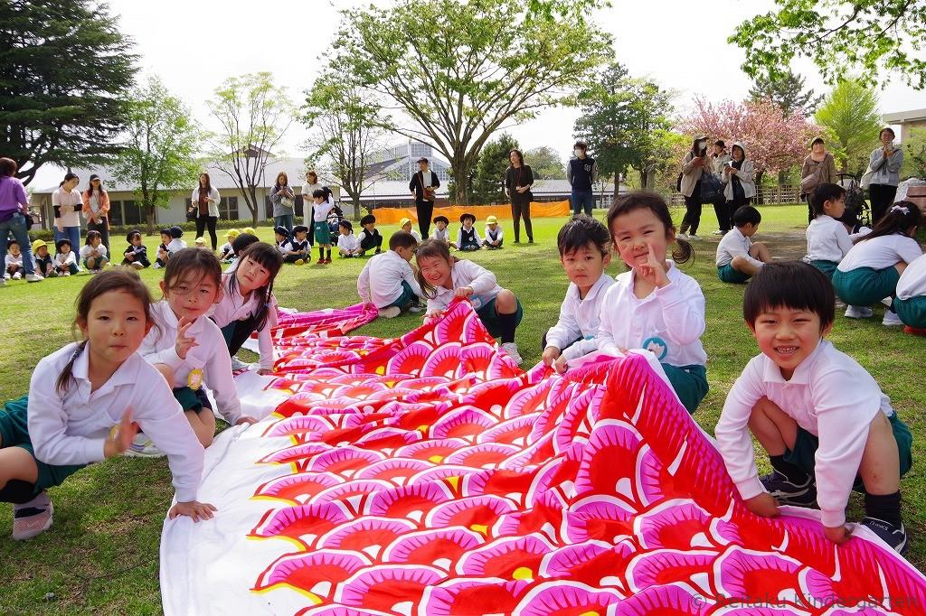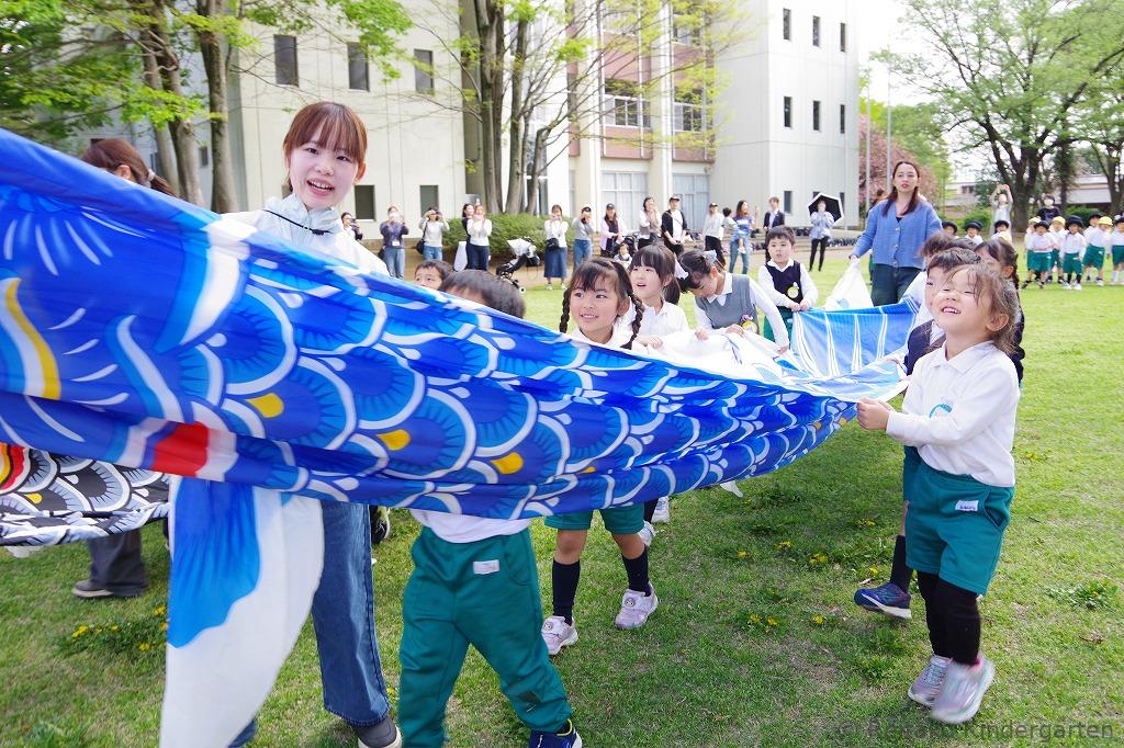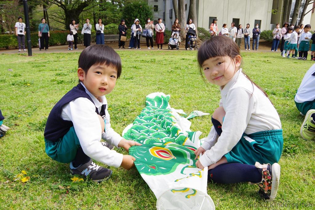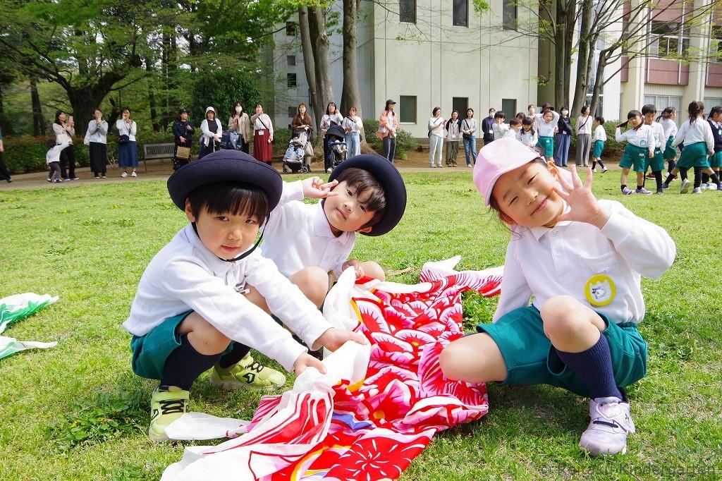 4月13日(月)、年長児はキャンパス中央広場で「こいのぼりの揚げ初め式」に参加しました。芝生の上には、ヒゴイやマゴイ、吹流しなどのこいのぼりが横たわり、「屋根より高いこいのぼり」の文字通りの大きさに子どもたちは驚いた様子でした。