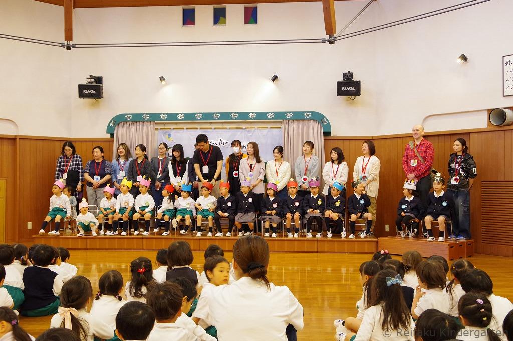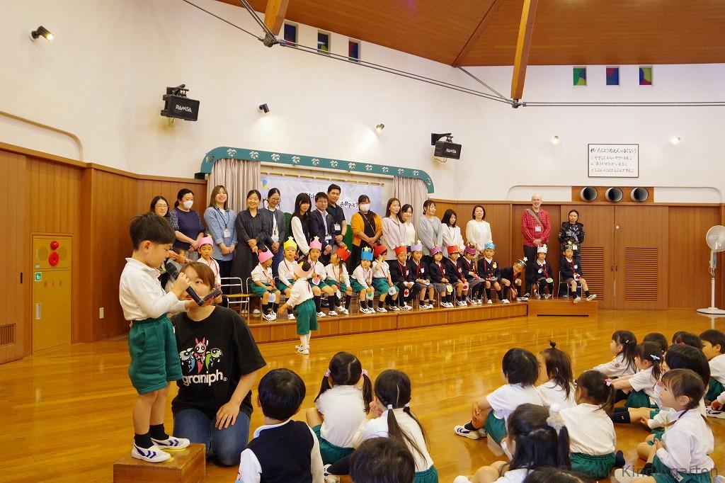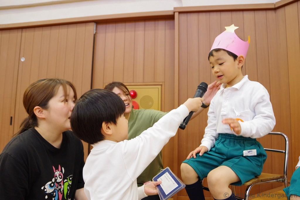 遊戯室では、最初に保護者の方と一緒に誕生児が入場してきました。前に勢ぞろいした誕生児のお友だちは、緊張しながらもみんなニコニコ顔です。誕生会の司会は、年長組が担当し、誕生日を迎えたお友だちへのインタビューもありました。みんな質問にとてもハキハキと答えていました。