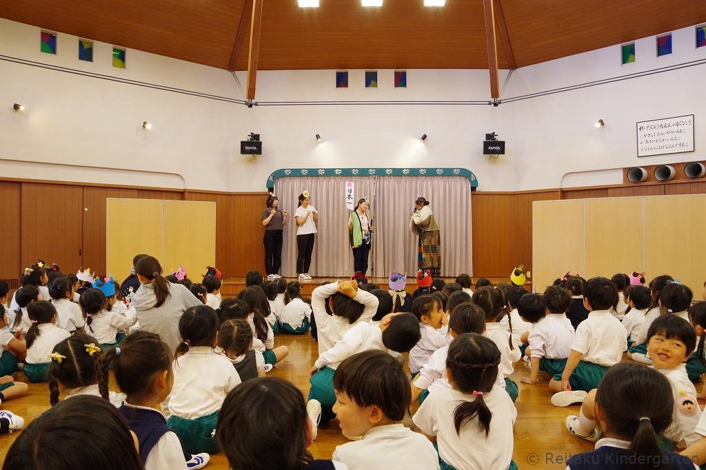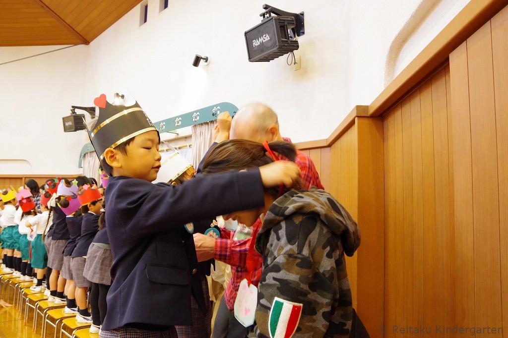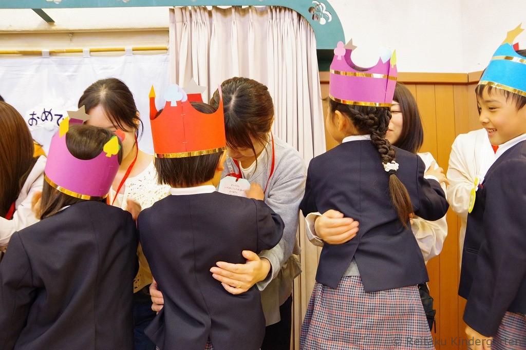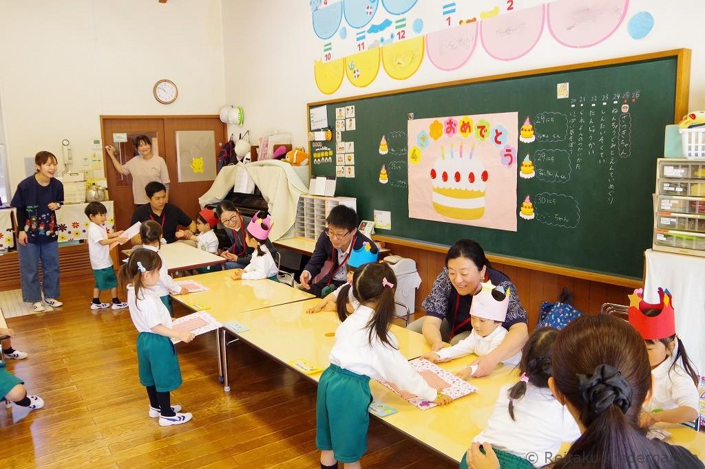 新入園児にとっては、初めての誕生会です。「誕生会って、どんなことをするのかな?」とみんなこの日を楽しみにしていました。遊戯室で先生方による出し物を見た後、各教室でも誕生児のお祝いをしました。誕生児の保護者の方も一緒に参加していただきました。