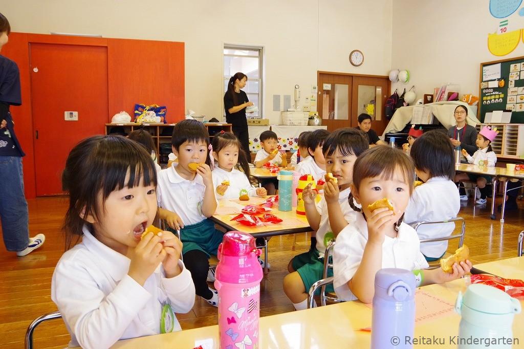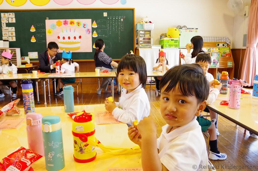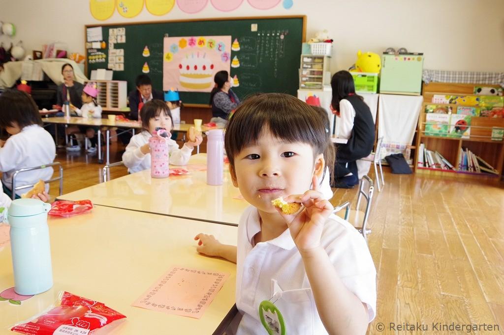 最後に先生の出し物、桃太郎の劇がありました。記念撮影後、教室に戻って、ケーキを食べながらみんなでお友だちの誕生をお祝いします。年少組の新入園児は、初めての誕生会とても楽しかったようです。ケーキもニコニコしながらおいしそうに残さず食べていました。